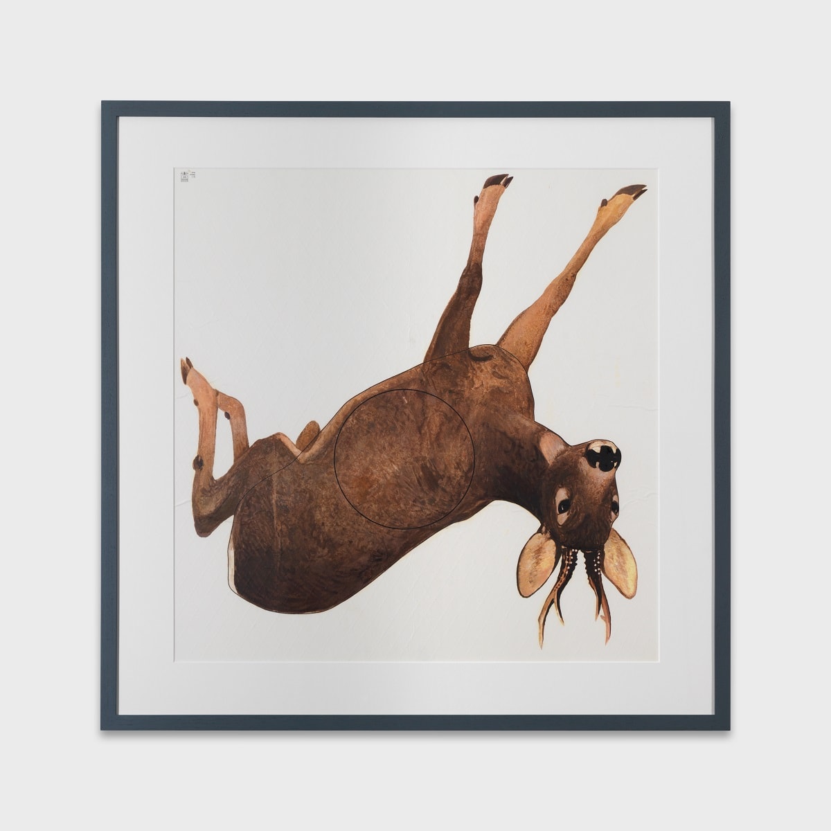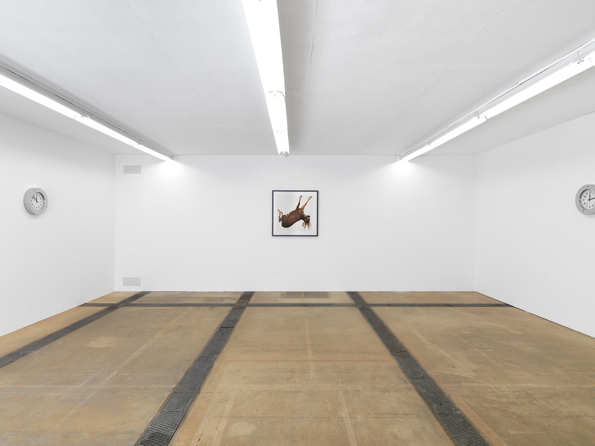 In his practice, Aceto questions the notions of time, of personal mythology and his own past. His work is marked by the different personalities which he has encountered and involved in his projects, such as Paola Pivi, Roberto Cuoghi and Stephanie Moisdon. For example, his first artistic intervention came about when he asked French artist Sophie Calle – for whom he had a deep obsession – to tattoo her signature on his arm, thus making him part of her work. The clocks presented in Refaire le Portrait, Acte #1 were also born from an encounter, this time with the Italian philosopher Gianni Vattimo. The philosopher suggested that the artist make a work which would reactivate an anecdote from Walter Benjamin recounting a point during the French Revolution when Revolutionaries would shoot at the clocks of Paris to break the continuum of History. This idea of the target can also be found in the illustration of a deer, taken from a training target for hunters. This piece can be seen as a kind of anti-painting, in the sense that Aceto waives any pictorial or stylistic gesture, repainting the target in a hyperrealist manner, like a fake readymade. This series stems from the artist’s own experience, when, as a kid, he spent his holidays painting by a window, watching the hunters shoot. Fascinated by the equipment they used, Aceto borrowed the targets the shooters used for training and presented them as a result of his work.