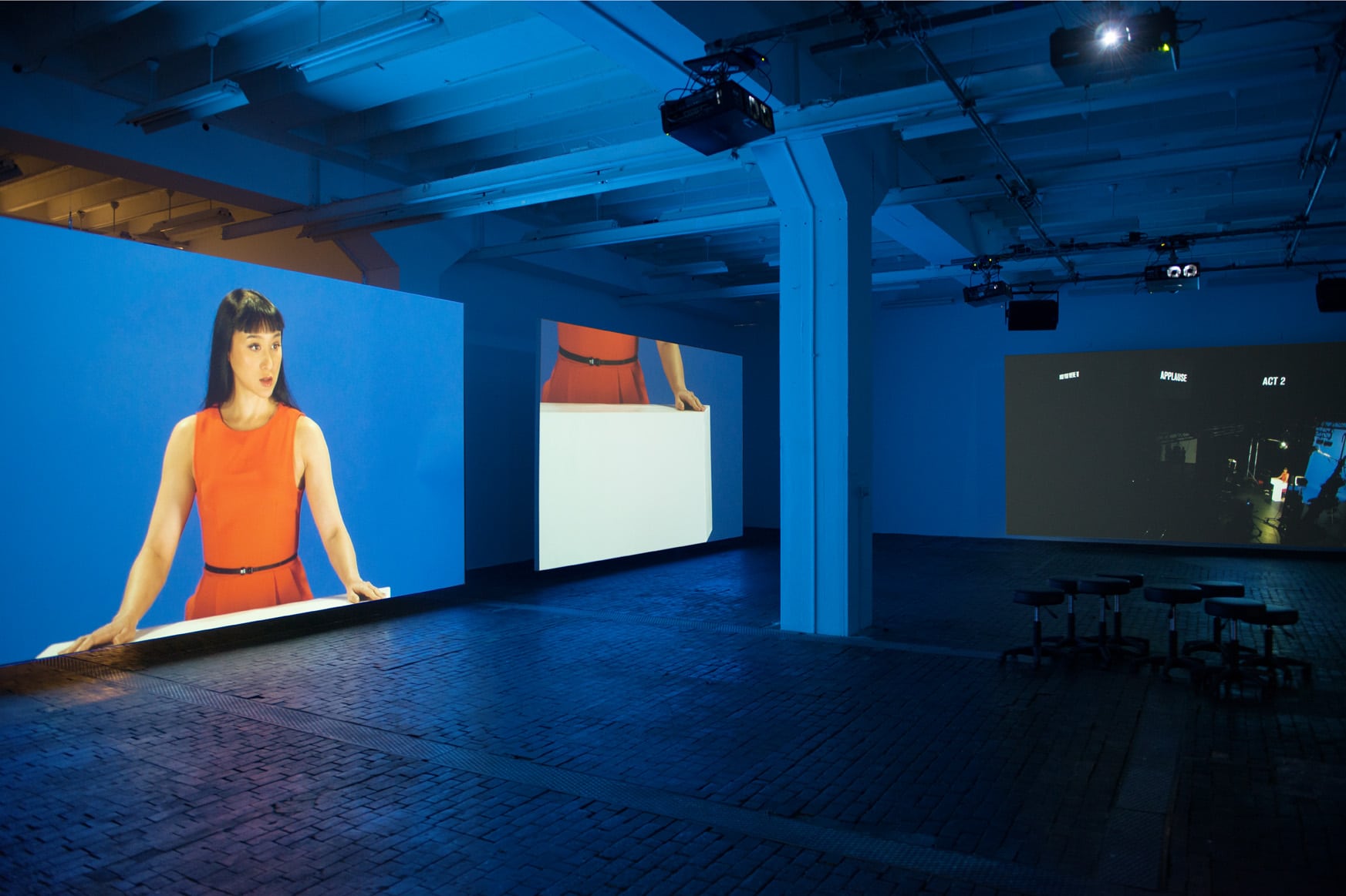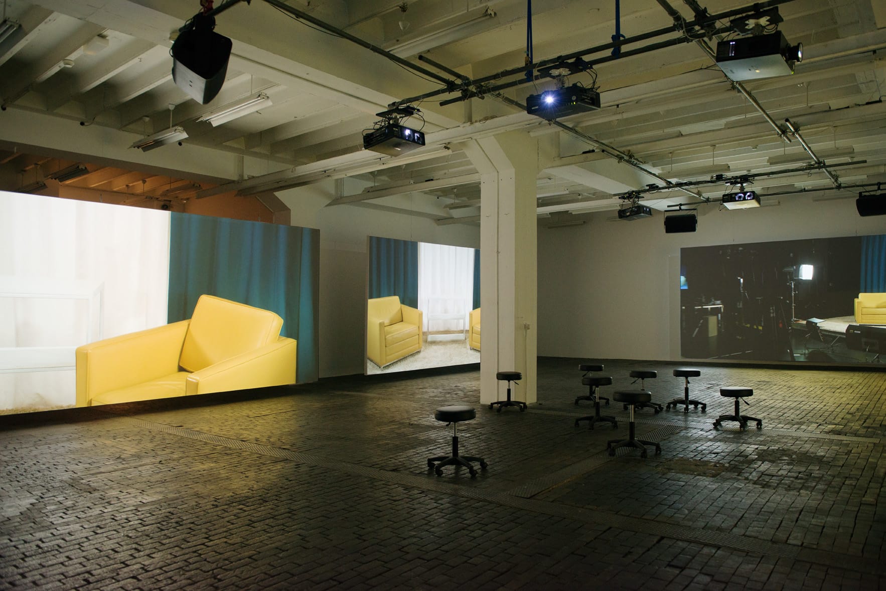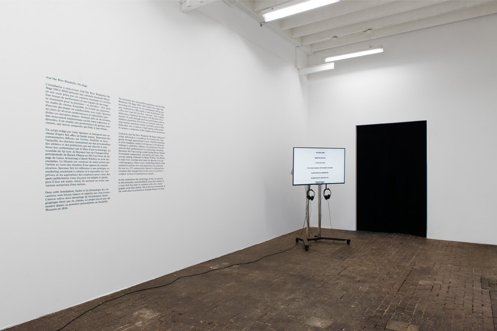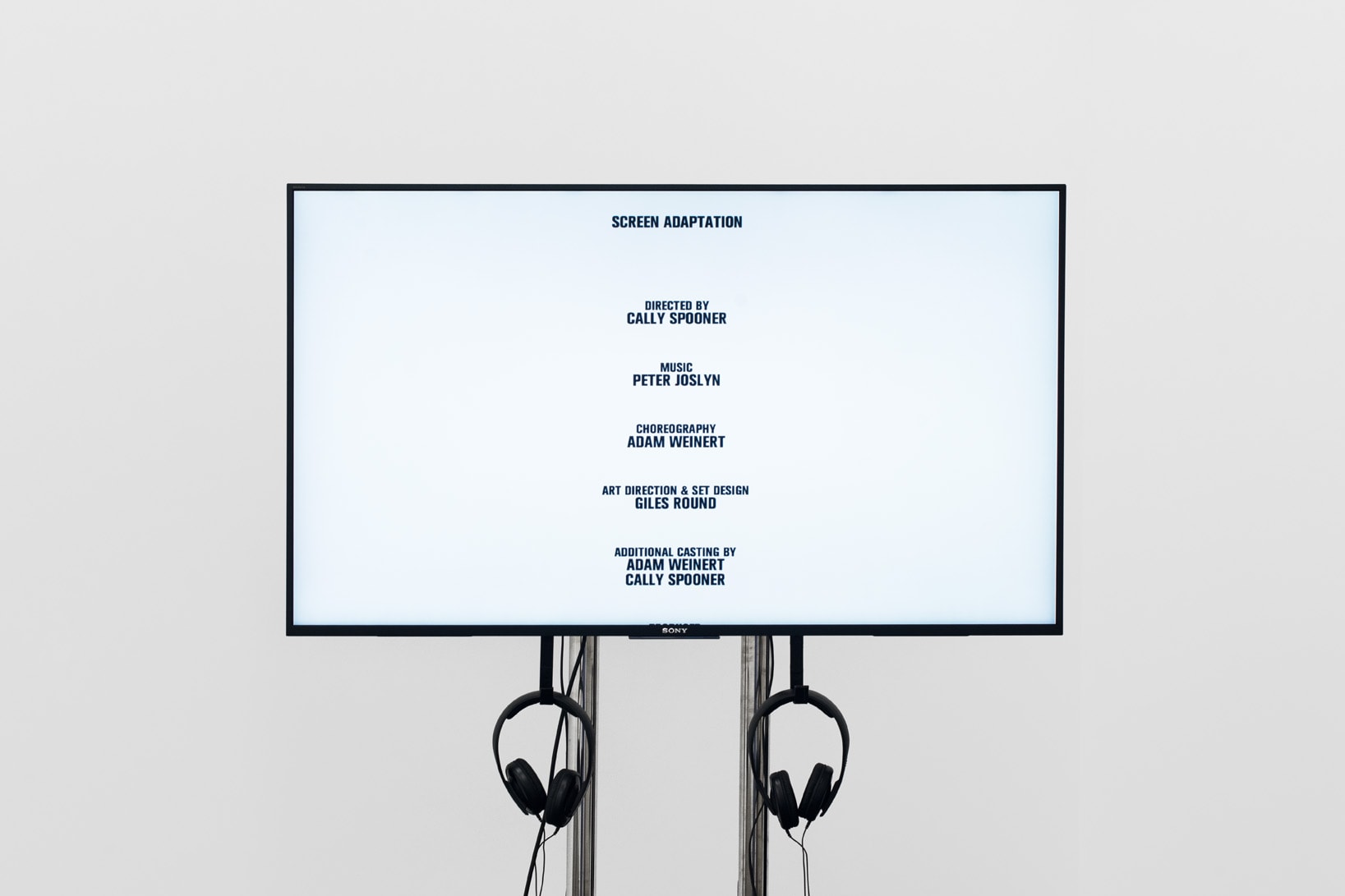 On the second floor is Spooner’s multi-person performance-to camera, And You Were Wonderful, On Stage (2013 – 2015); a work which has more in common with a live choreographic event than cinema. In this five-channel installation, a musical is shot in a single take. A chorus line gossip about celebrities, athletes, and politicians who outsourced their performance to a technology, whilst a marketing practice is quoted in which employees’ words and voices are tweaked to TV-commercial perfection. This is the first presentation of the work since its premiere at the Stedelijk Museum in 2016.