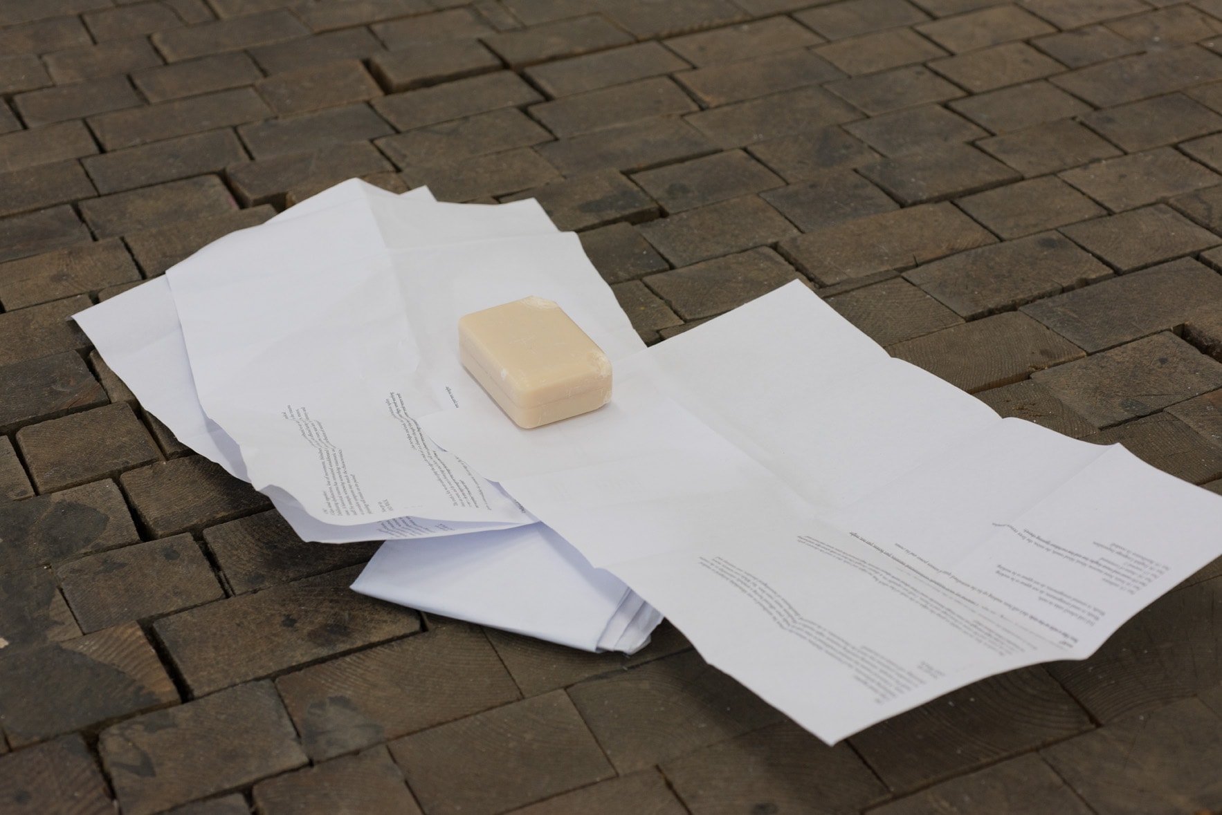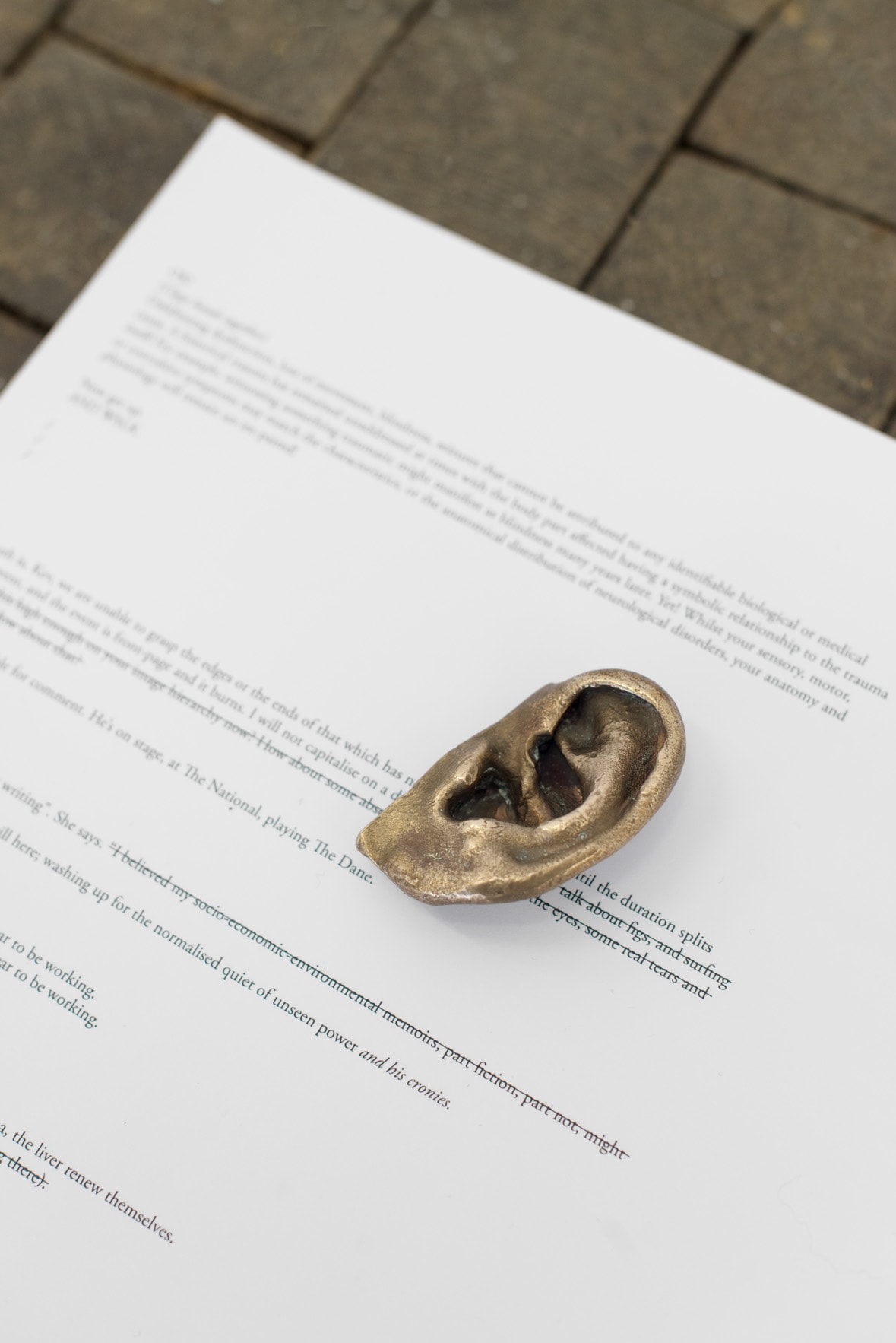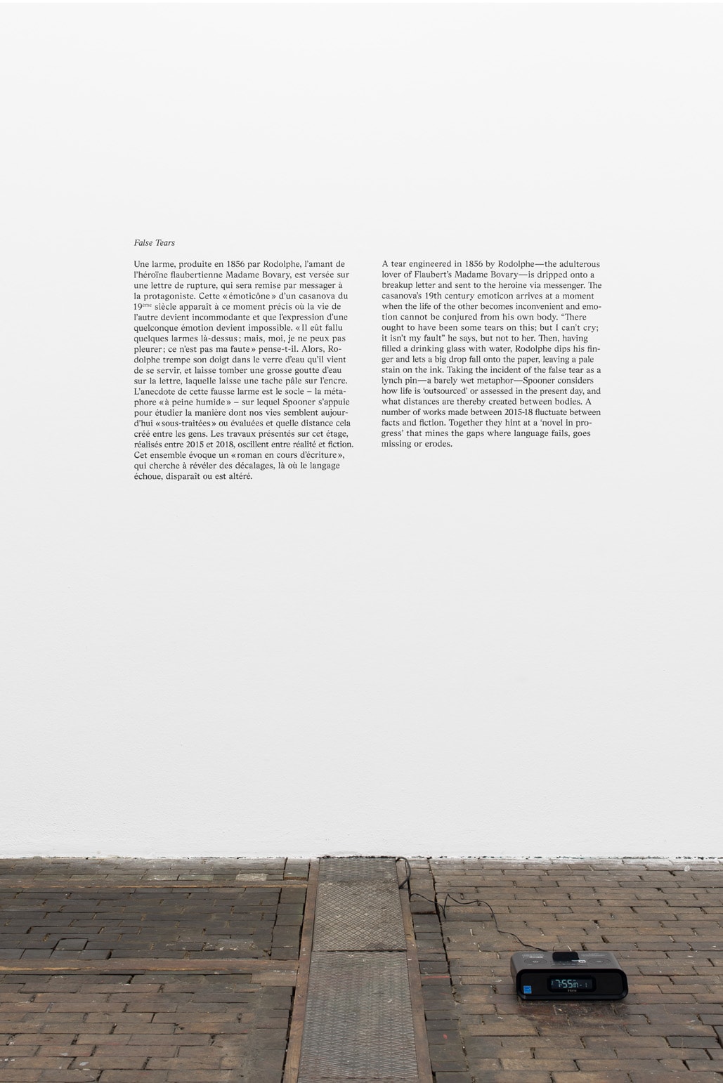 On the third floor, works created between 2016– 18, comprising objects, sound and live events create an ecosystem of fact and fiction, hinting at a ‘novel in progress’. Events that relate to shock and grief are evoked across narratives, then juxtaposed with expanded definitions of outsourcing and a single false tear, sustaining one another in an un-synced constellation of aliveness and deadness. Spooner is calling the sum total of the third floor ‘a fiction’, knowing that fiction is always only a few degrees removed from reality, at a moment in time when language is undergoing damage, and facts are being neglected.