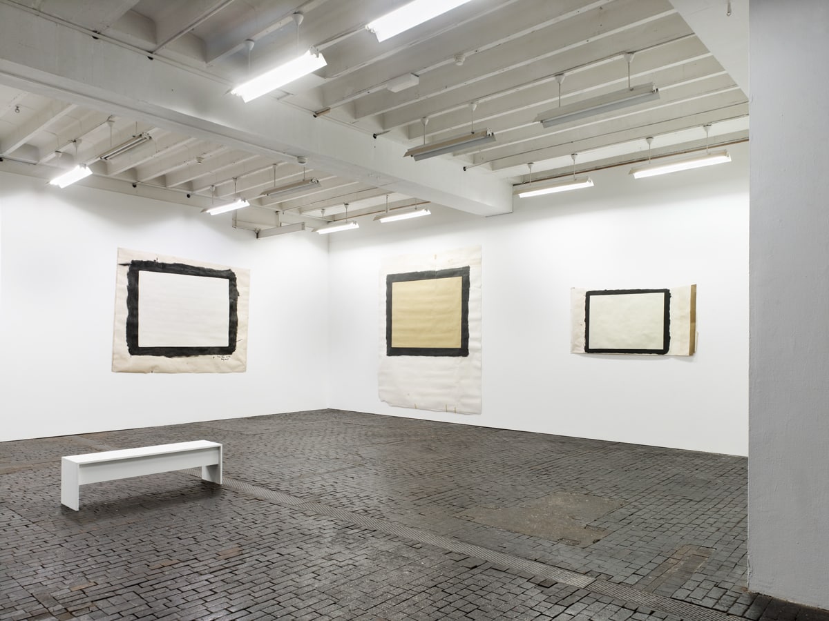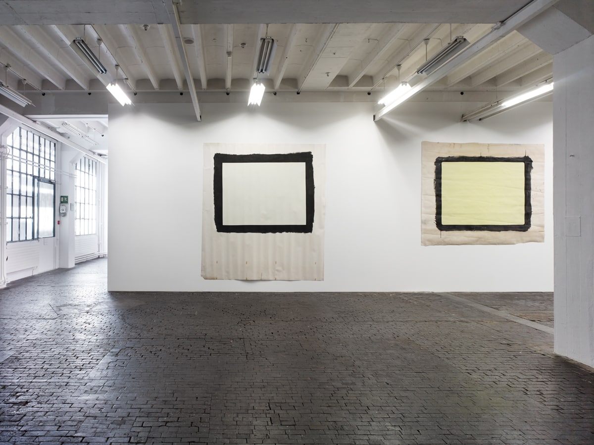 Large abstract paintings resemble blank cinema screens. Painted with cheap house paint on large scrolls of paper, they have yellowed considerably over the years, like an impossibly slow movie made of nothing but light, time, paper, and paint.