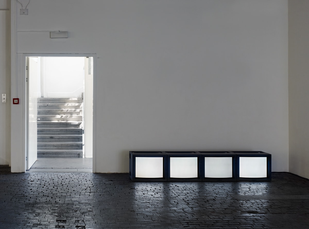 Four screens slowly change from black to white and back again, while two voices whisper a few soft words to each other. The full cinematic arc of anticipation, climax, and loss is contained within this abstract fragment from a film that isn’t there. It is a story that has lost its linearity and finds itself between melancholy and suspense: it has already happened, it’s happening, and it hasn’t happened yet.