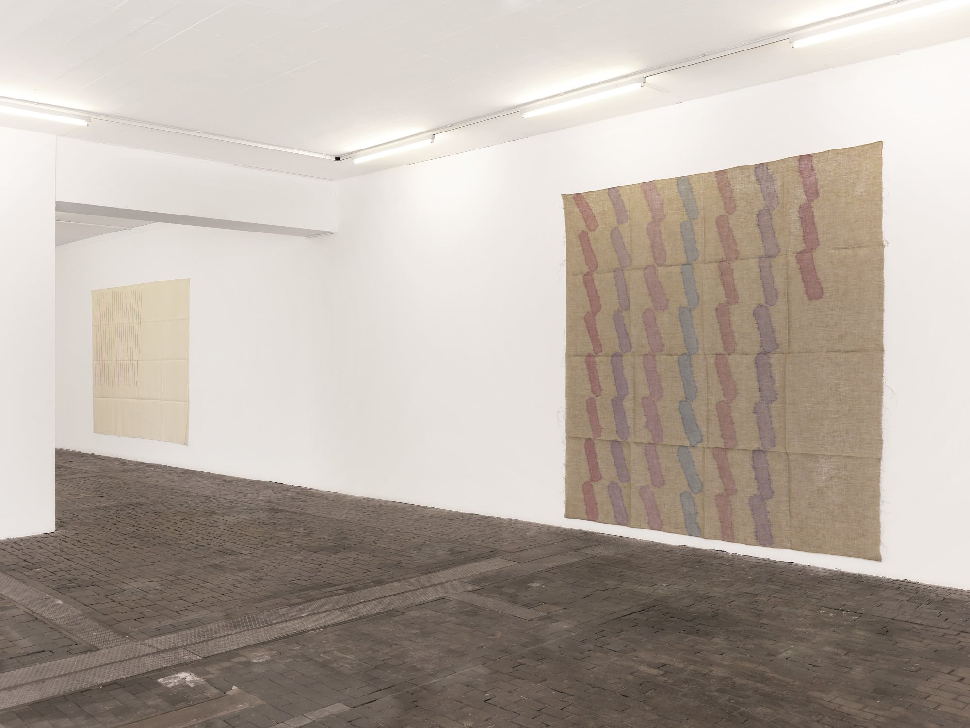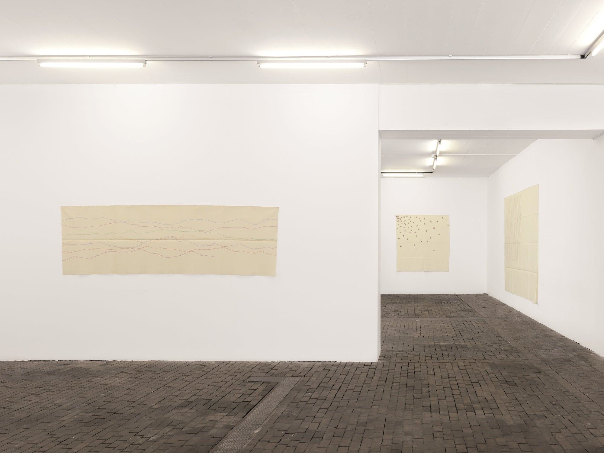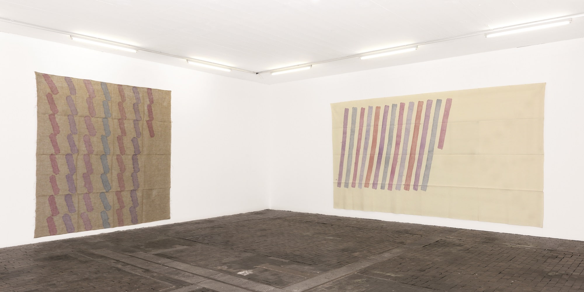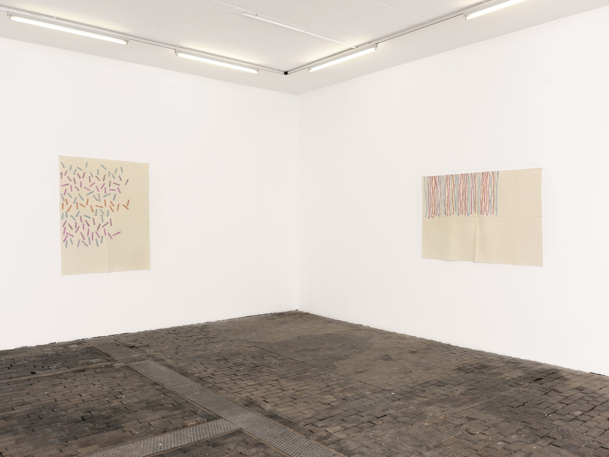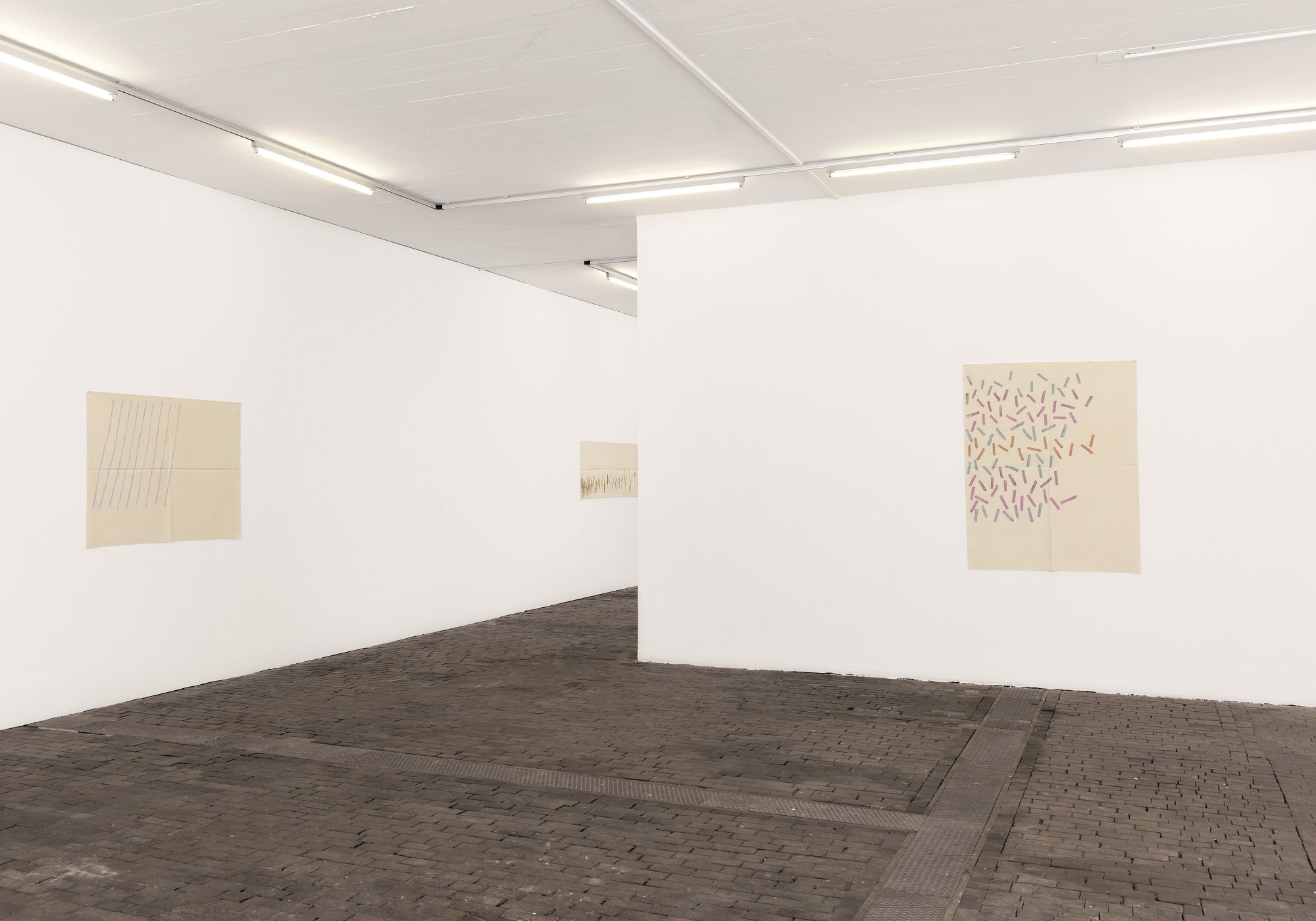The work of Griffa transcribes an idea of rhythm, sequence and the repetition of minimal gestures on non-stretched canvas, nailed to the walls and simply folded when not on display. The grid created through constantly folding them becomes part of the paintings’ pattern, erasing the distinction between support and surface as well as abolishing the idea of painting as “open window”.