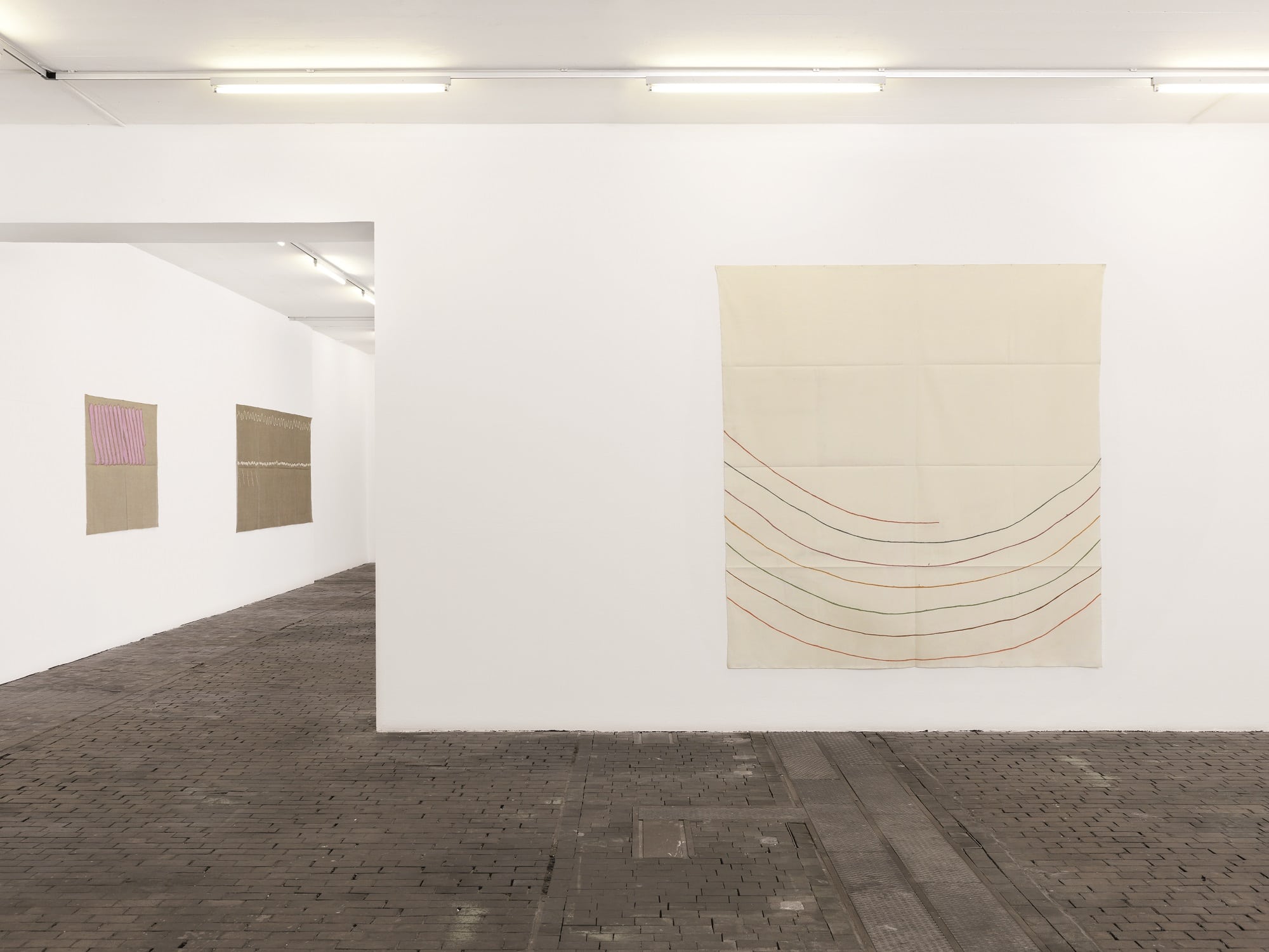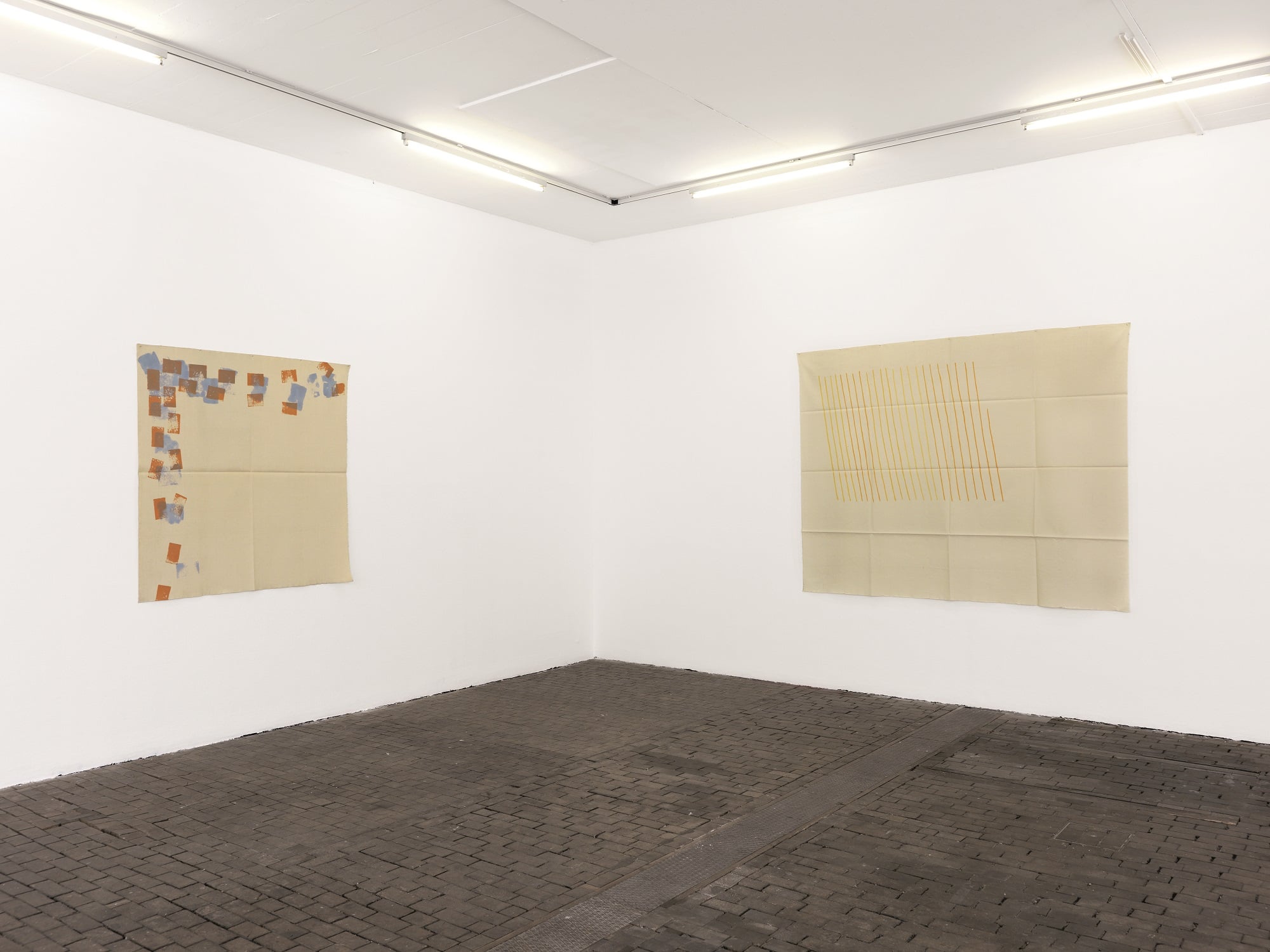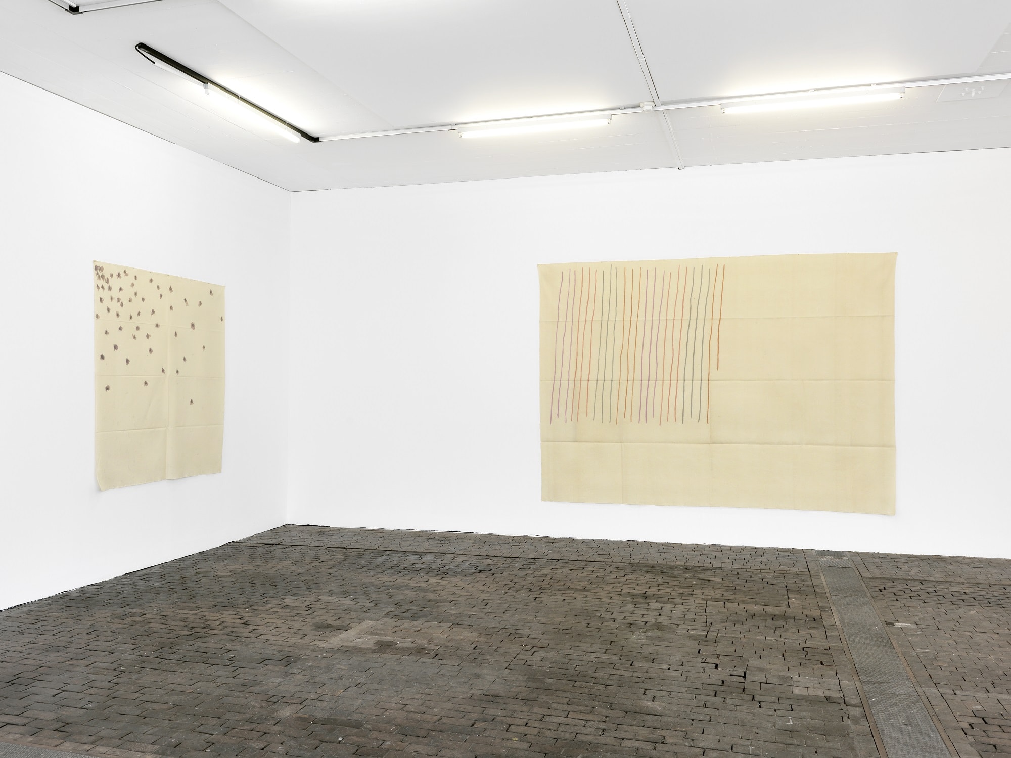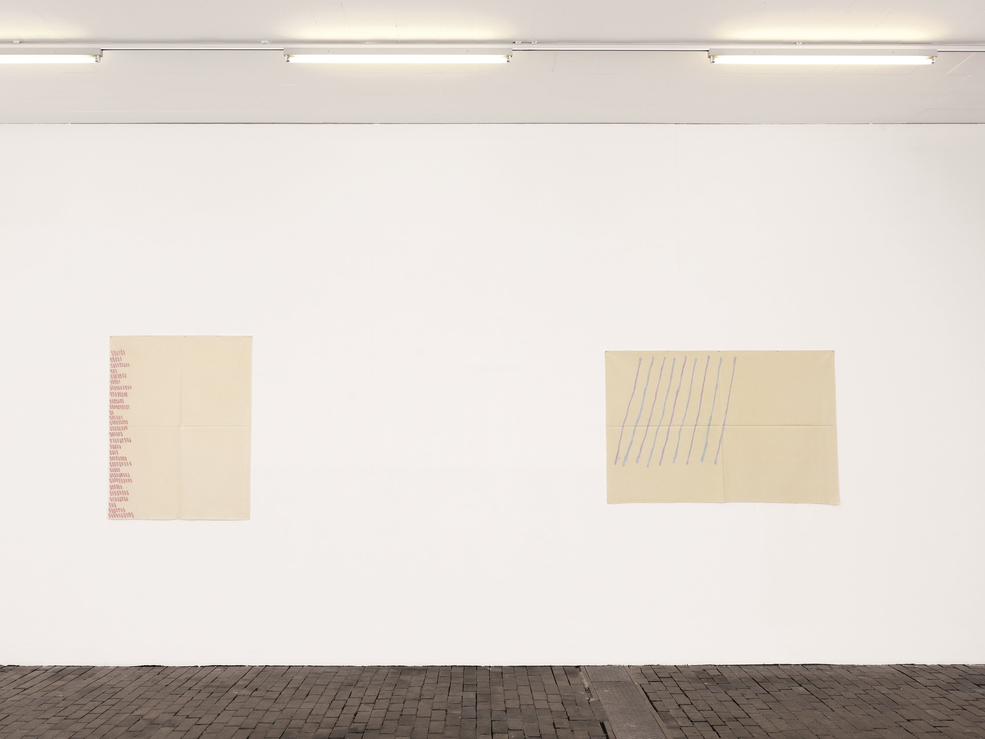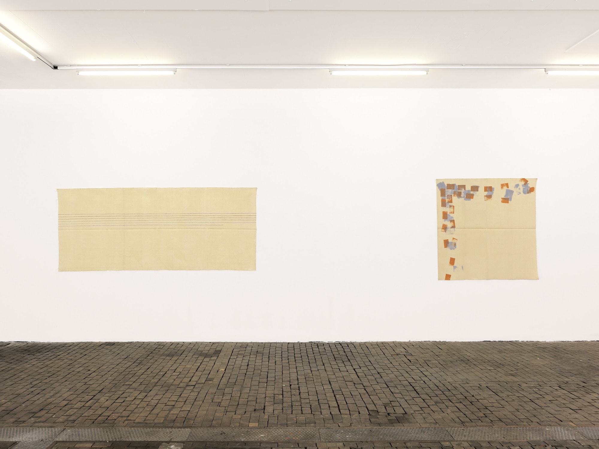 The work of Griffa transcribes an idea of rhythm, sequence and the repetition of minimal gestures on non-stretched canvas, nailed to the walls and simply folded when not on display. The grid created through constantly folding them becomes part of the paintings’ pattern, erasing the distinction between support and surface as well as abolishing the idea of painting as “open window”.