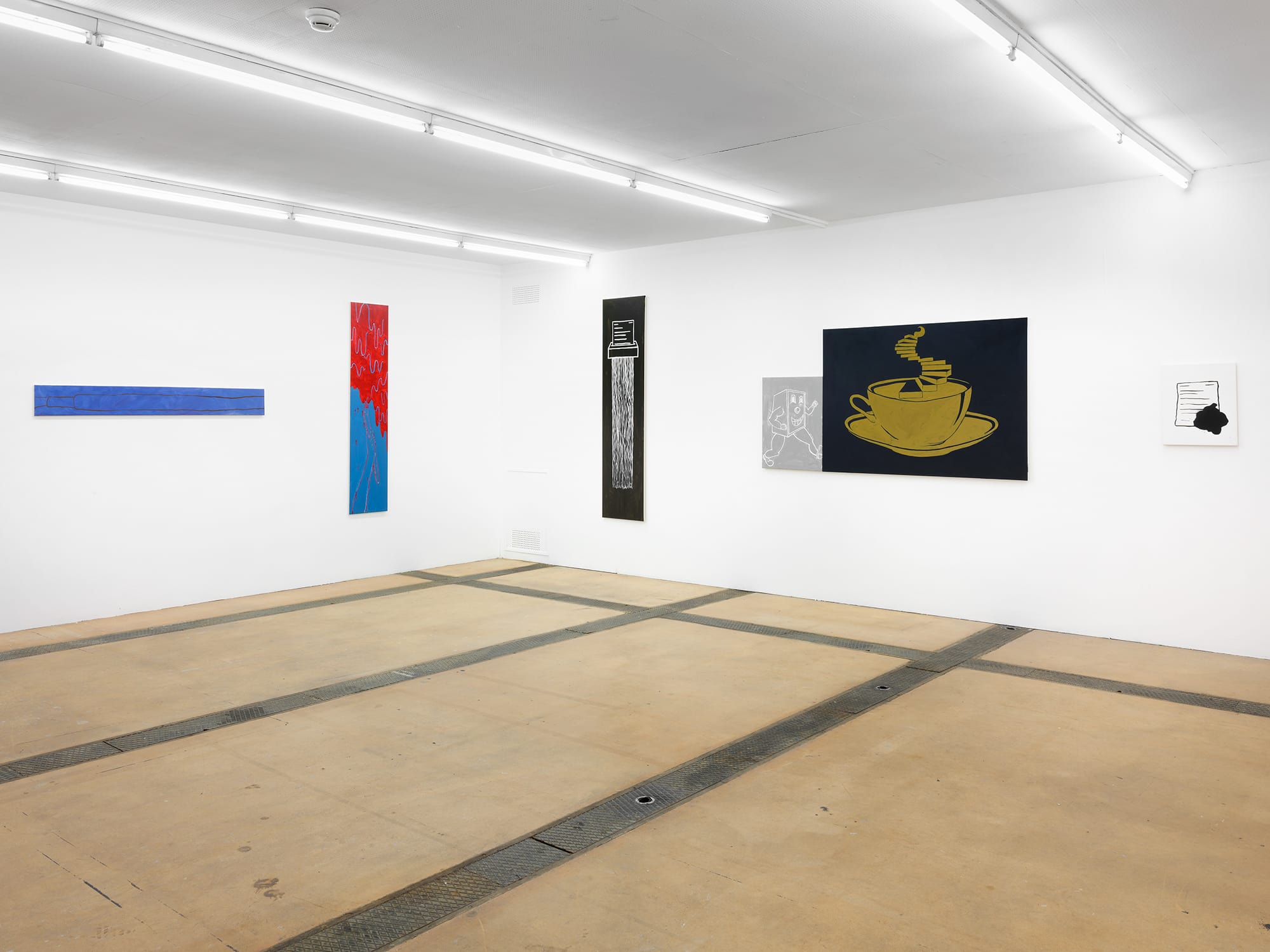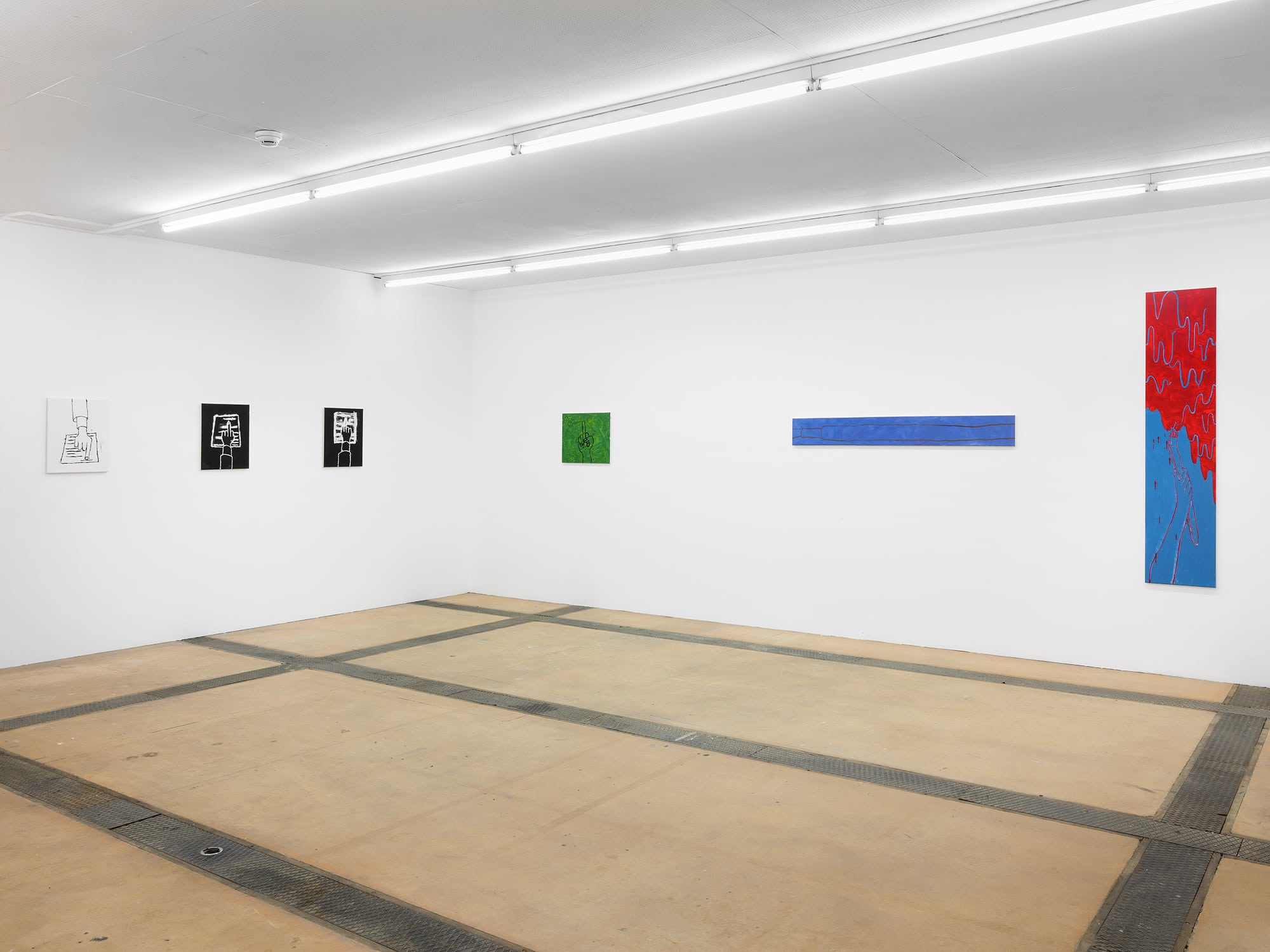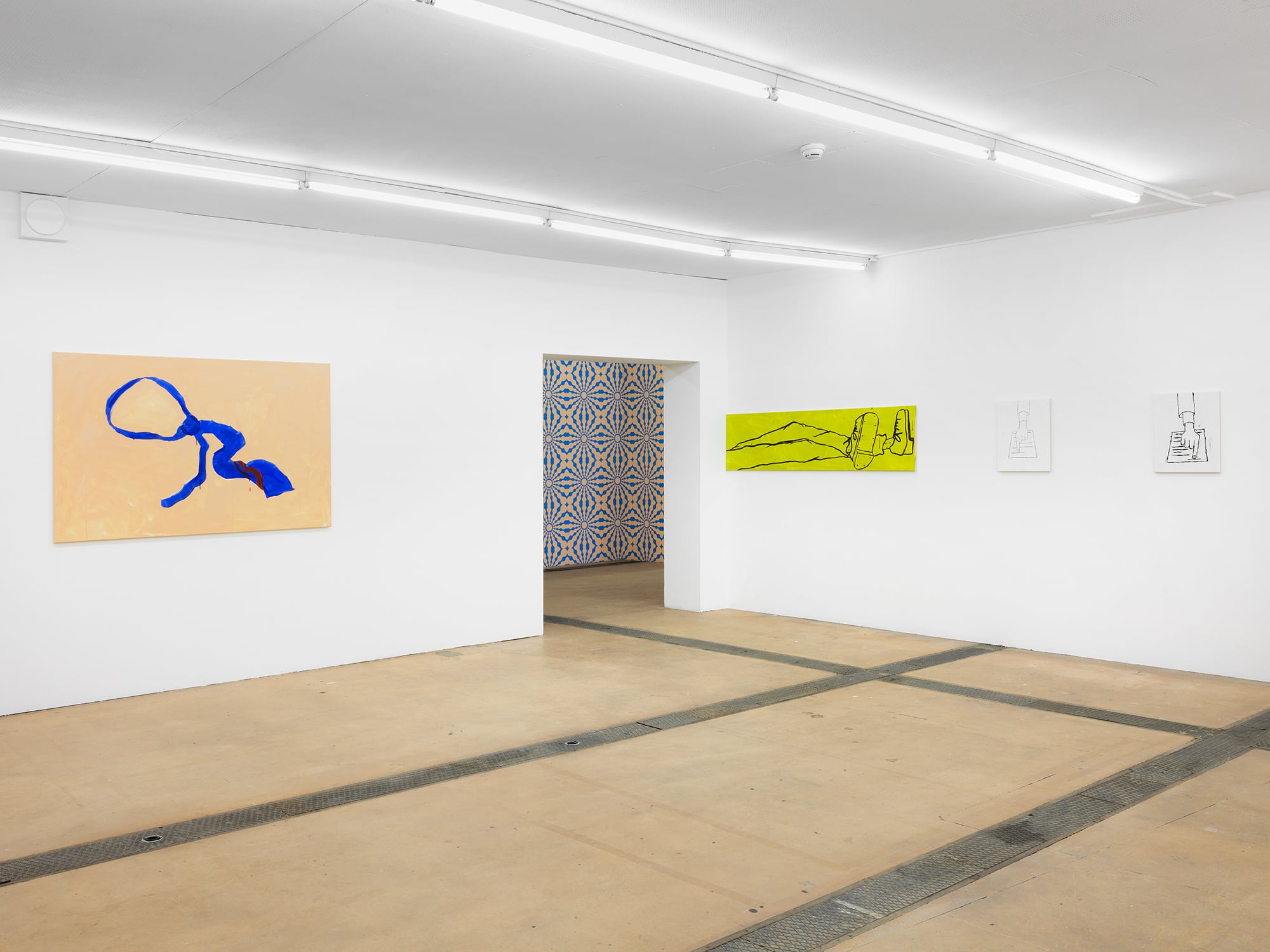 The 12 works presented in the exhibition of Grégoire Bolay (*1986), function as paintings and drawings, mostly lines painted onto backgrounds. In the same way that individuals have become boss and employee, mirroring this collapse, the works of Grégoire Bolay are both paintings and drawings. To try and escape that logic, these works, like a slowdown strike, perform the minimum which they are asked, introducing inefficiencies and deficiencies. They do not “perform” painting in a traditional sense, but they are more than drawings imitating painting. The Italian marxist continues “We live in hell, but in hell we have the capacity, an ironic capacity, to create sensitive lifespaces; a life which does not rule out joy as a possible dimension.”
