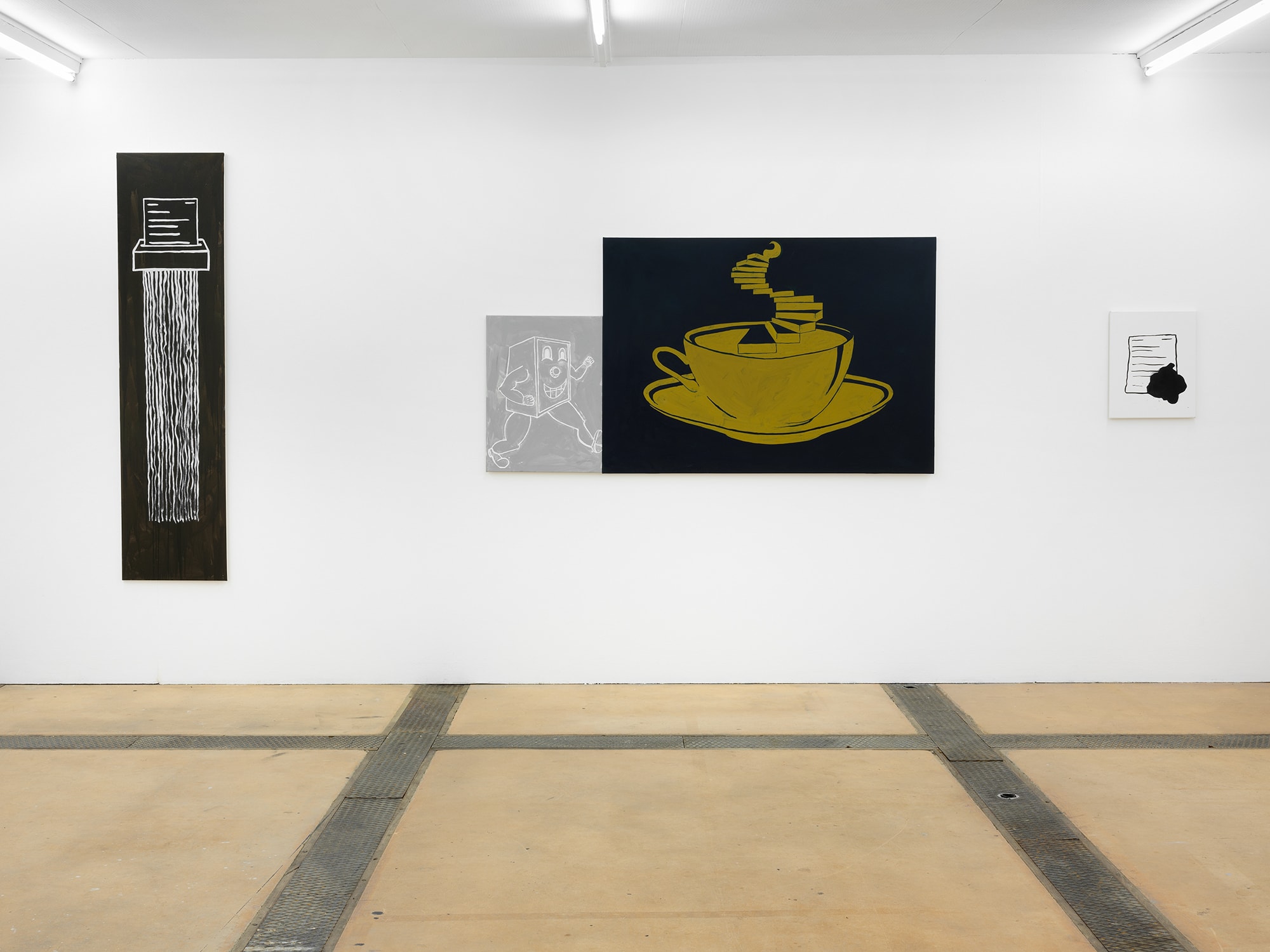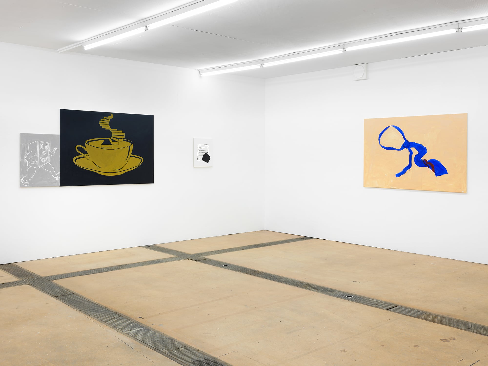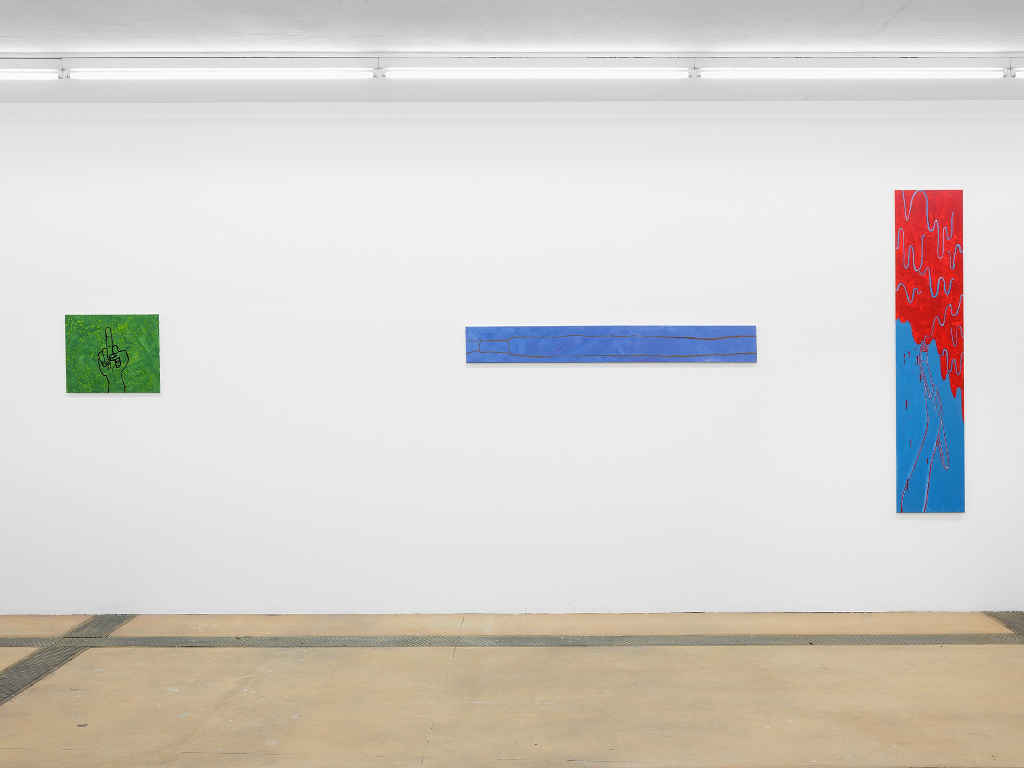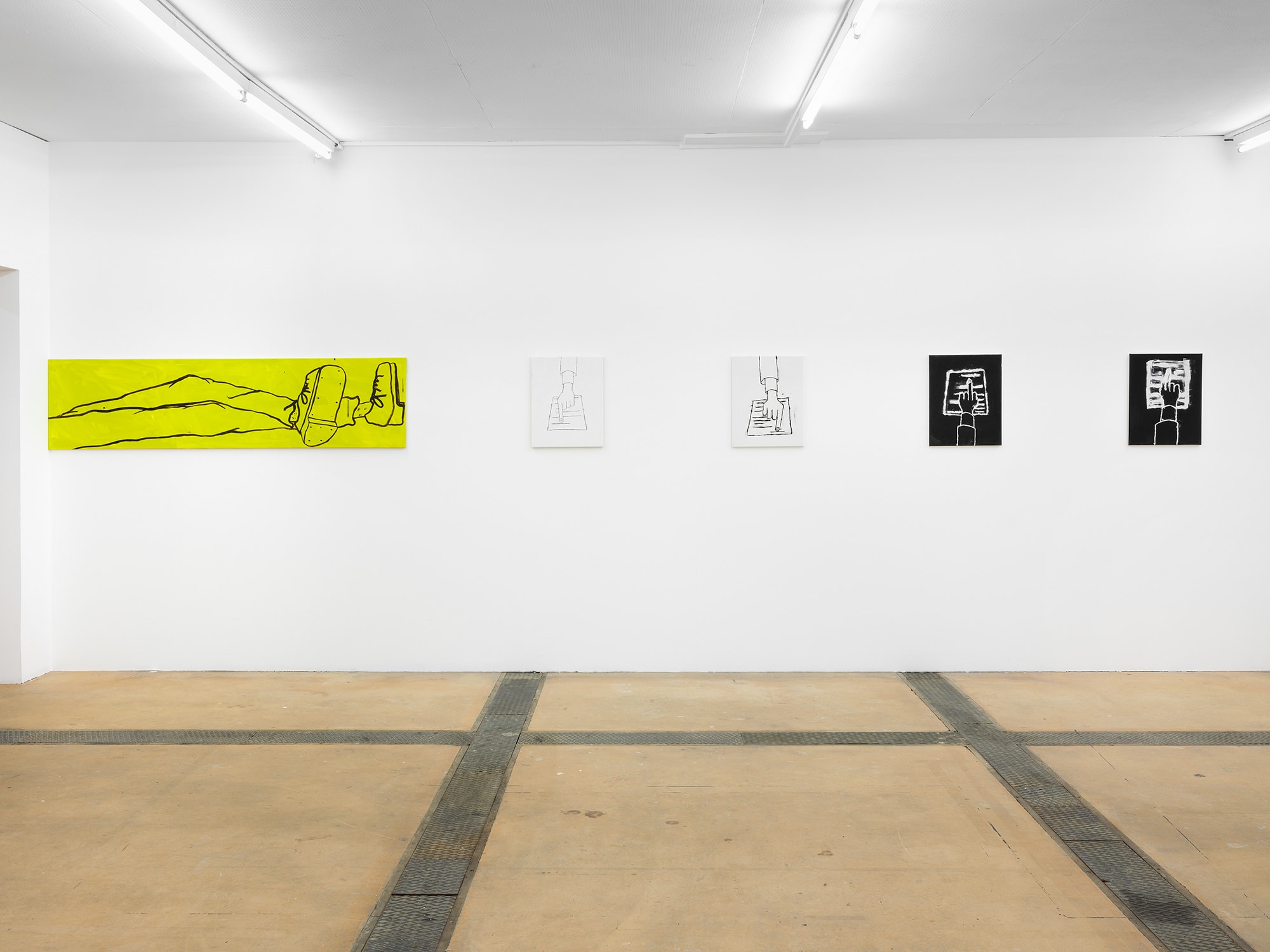 The tropes of productivity depicted here (the body at rest, the body at work, the office worker’s tie, coffee, the machine at work) circulate and create a narration, or an image of the world today. The middle finger (painted on the wrong type of canvas) is not a middle finger to the spectator, but a first person perspective of fuck you (FPPFU) which might be read as a critique of the medium, a critique of the system, a critique of the institution, or a rejection of all attempts at critique.