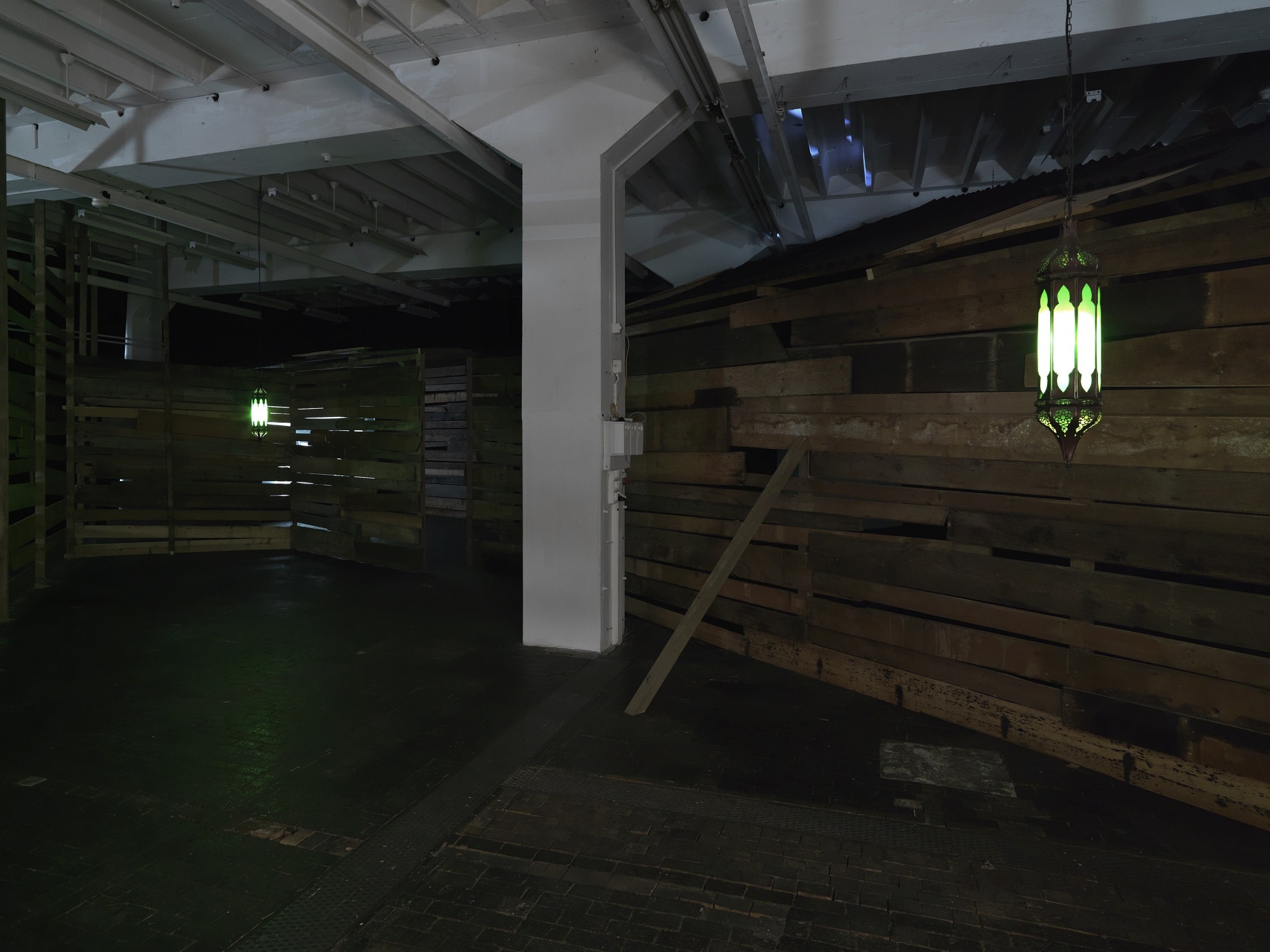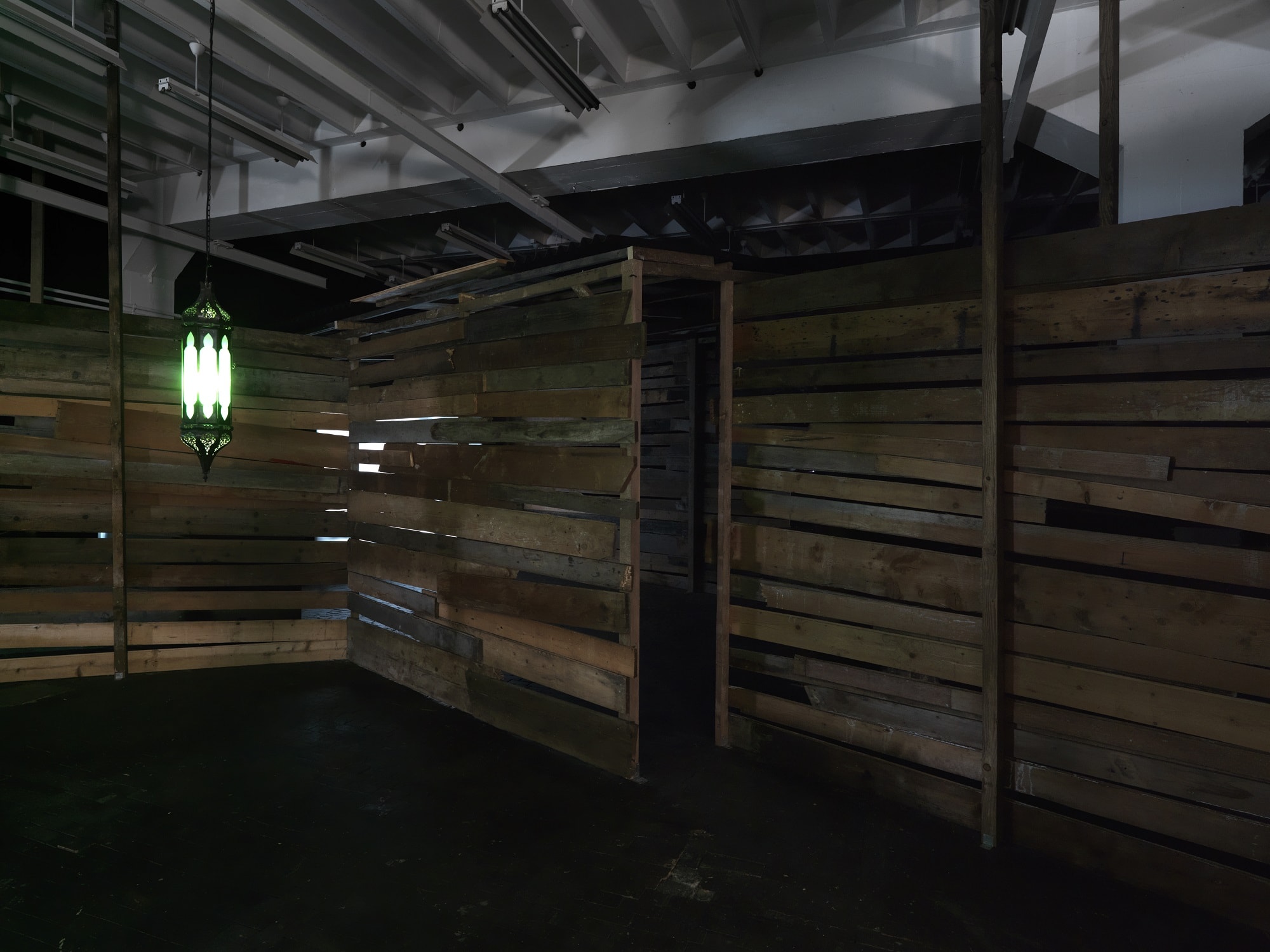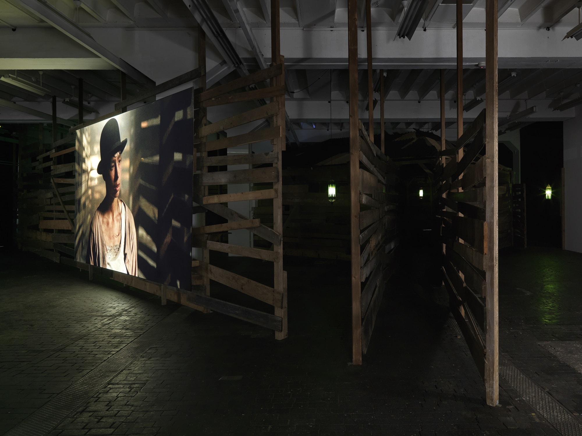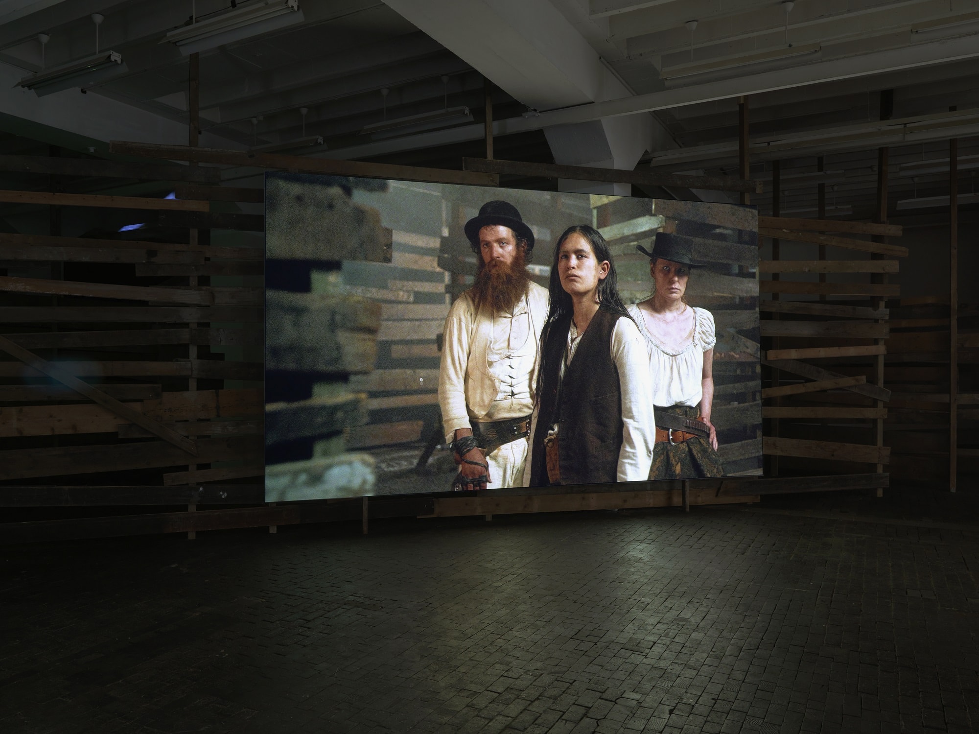 Joachim Koester’s exhibition at the Centre will feature a new video, surrounded by a huge installation in the form of tunnels and rooms made out of fragments of wood and occupying one whole floor of the building. Shot inside the installation, the film uses codes borrowed from the Western and presents four characters whose expressions and gestures suggest a ritualized duel. As the actors switch from miming attack and defense to tribal gesticulations, the effect is of a state of trance in which the body seems like a suit of armor the protagonists are trying to pierce. The title of this work, The Place of Dead Roads, is also the title of the exhibition and is taken from a novel by William S. Burroughs.