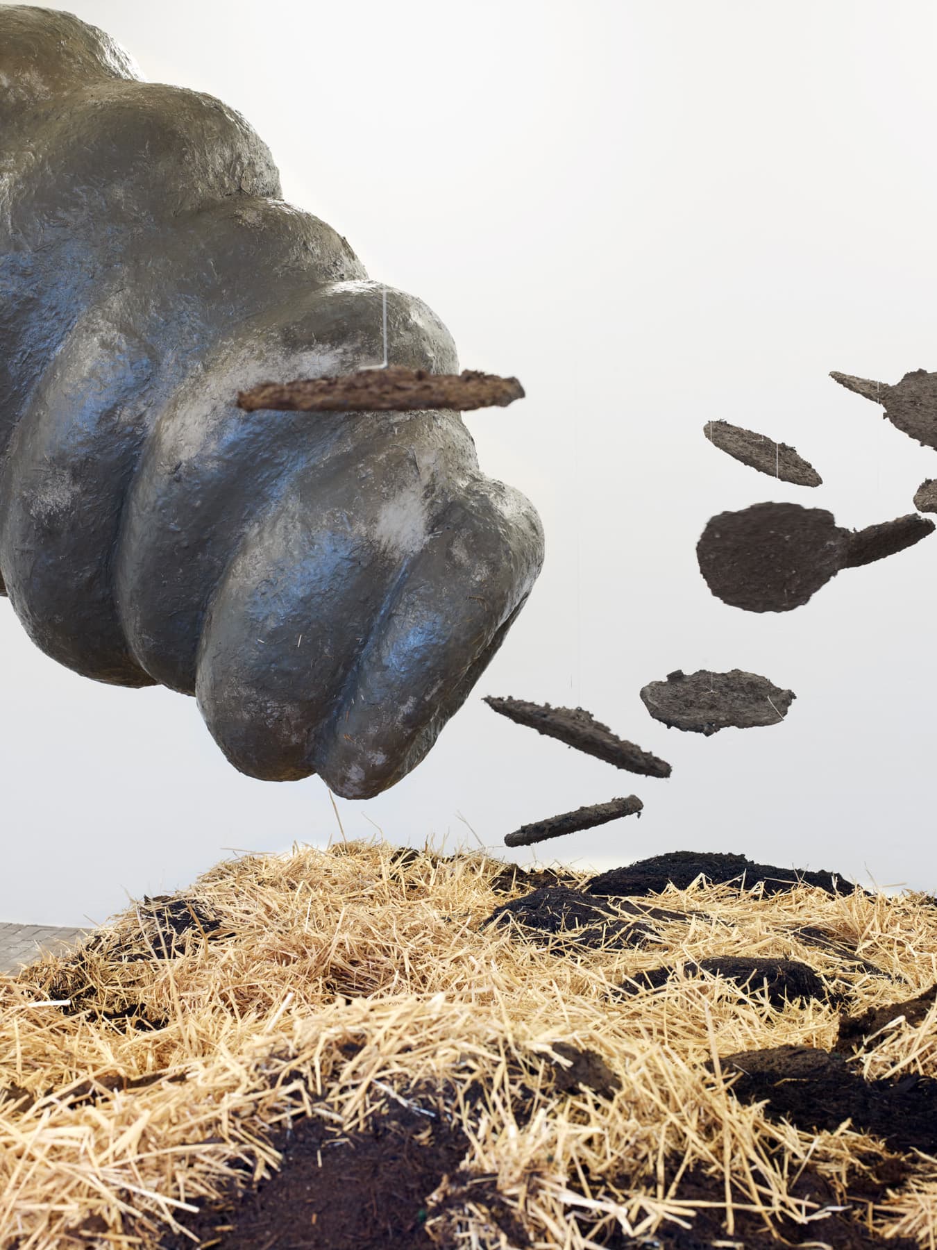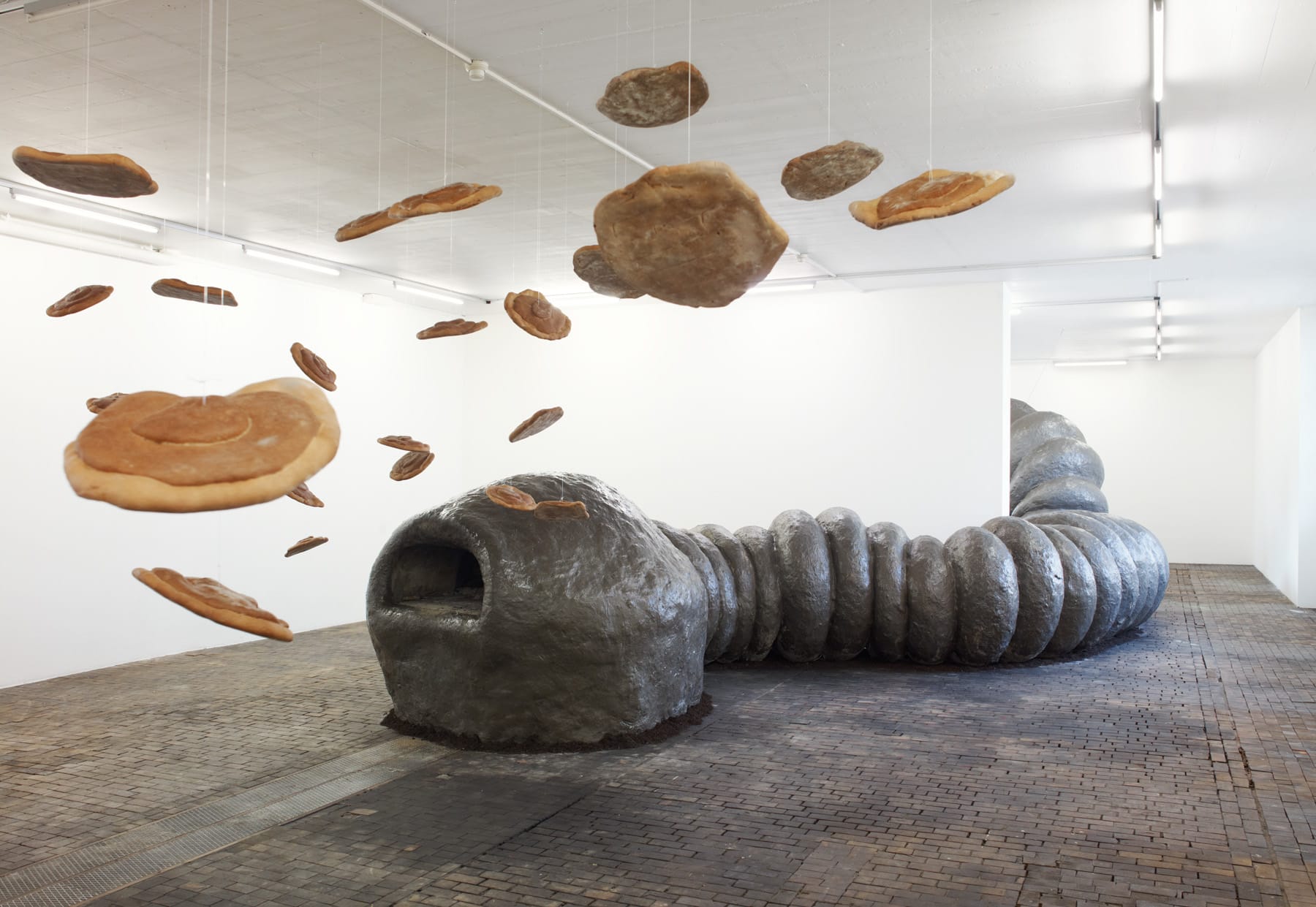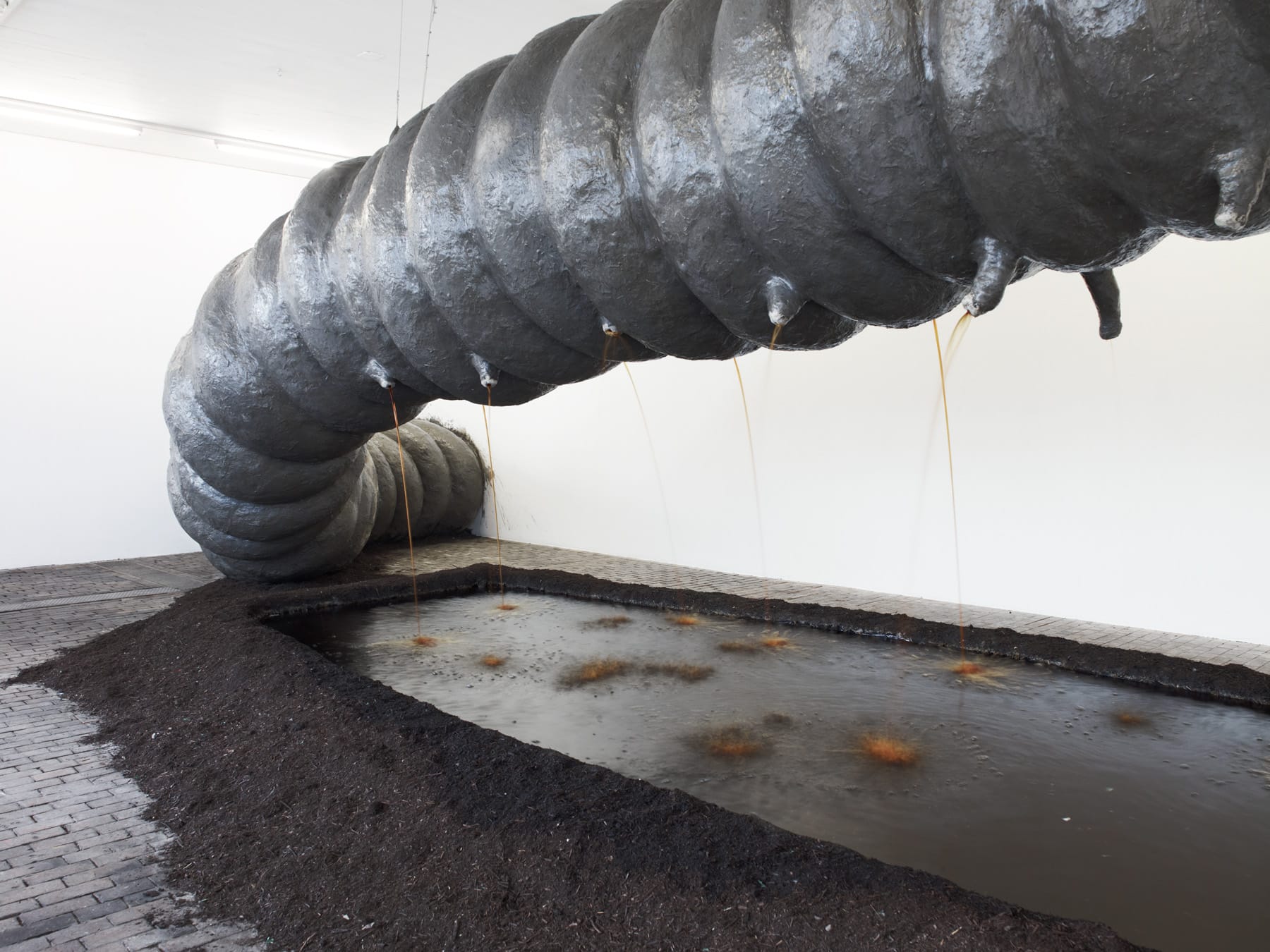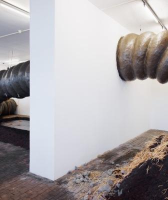 This monumental sculpture represents a giant earthworm that spreads across the exhibition rooms. The project is freely inspired by the post-apocalyptic visions in J. G. Ballard’s first four novels The Wind From Nowhere, The Drowned World, The Drought, and The Crystal World. In each room, a part of the worm’s body is associated with one of Ballard’s destructive natural elements: fire, air, or water. The earthworm also symbolically represents an ecological cycle. The earthworm has the shape of a snake, whose figure is ambivalently connoted, both sacred and evil, in many cultures. The reptile is mentioned in the very title of the work, as it refers to anthropologist Jeremy Narby’s The Cosmic Snake, which analyses the shamanic practices of certain Latin American ethnic groups. KLAT also takes inspiration from alchemists’ snake symbolism – the figure of Ouroboros. When the animal bites its tail, having neither beginning, nor end, it symbolises the “Magnum Opus”, an esoteric representation of the evolution towards perfection in nature. This vision of the alchemical transformation echoes biodegradation and life cycles.