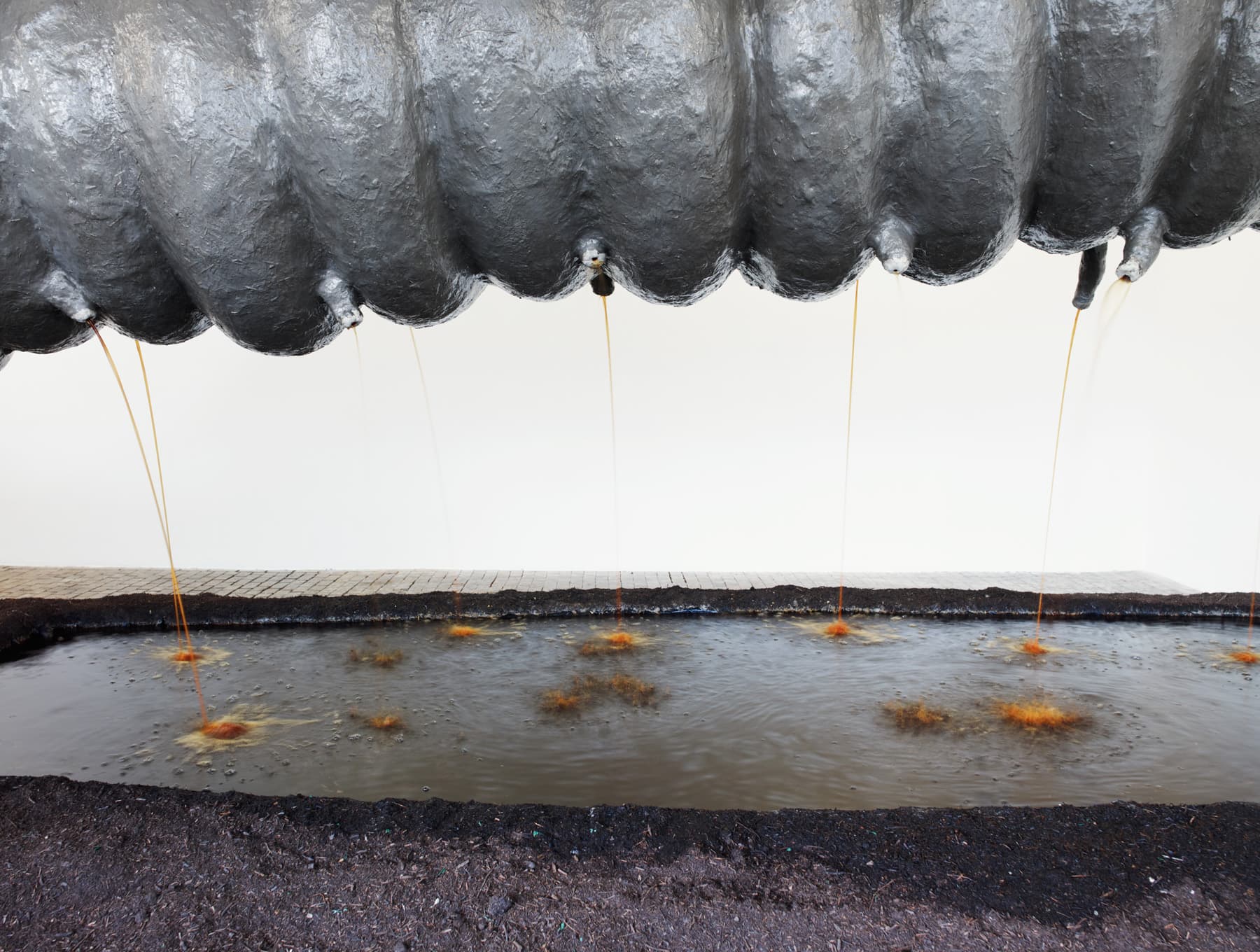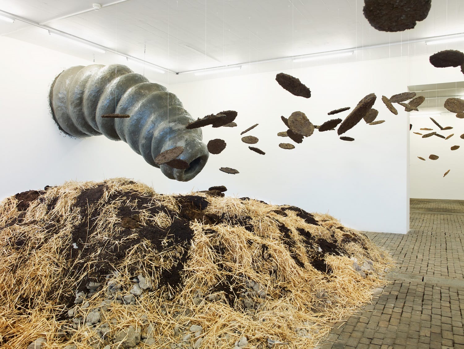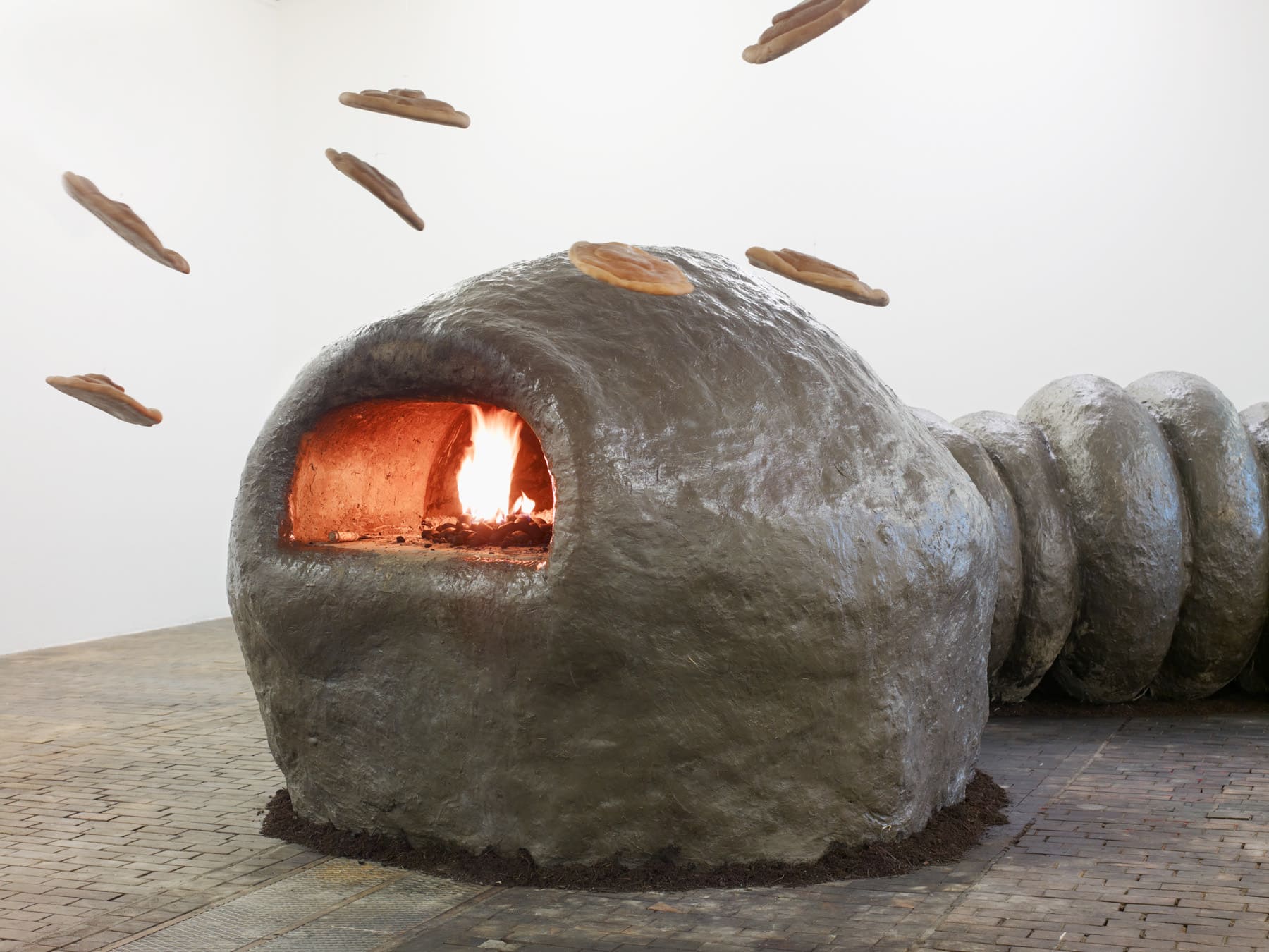 This monumental sculpture represents a giant earthworm that spreads across the exhibition rooms. The project is freely inspired by the post-apocalyptic visions in J. G. Ballard’s first four novels The Wind From Nowhere, The Drowned World, The Drought, and The Crystal World. In each room, a part of the worm’s body is associated with one of Ballard’s destructive natural elements: fire, air, or water. The earthworm also symbolically represents an ecological cycle. The earthworm has the shape of a snake, whose figure is ambivalently connoted, both sacred and evil, in many cultures. The reptile is mentioned in the very title of the work, as it refers to anthropologist Jeremy Narby’s The Cosmic Snake, which analyses the shamanic practices of certain Latin American ethnic groups. KLAT also takes inspiration from alchemists’ snake symbolism – the figure of Ouroboros. When the animal bites its tail, having neither beginning, nor end, it symbolises the “Magnum Opus”, an esoteric representation of the evolution towards perfection in nature. This vision of the alchemical transformation echoes biodegradation and life cycles.