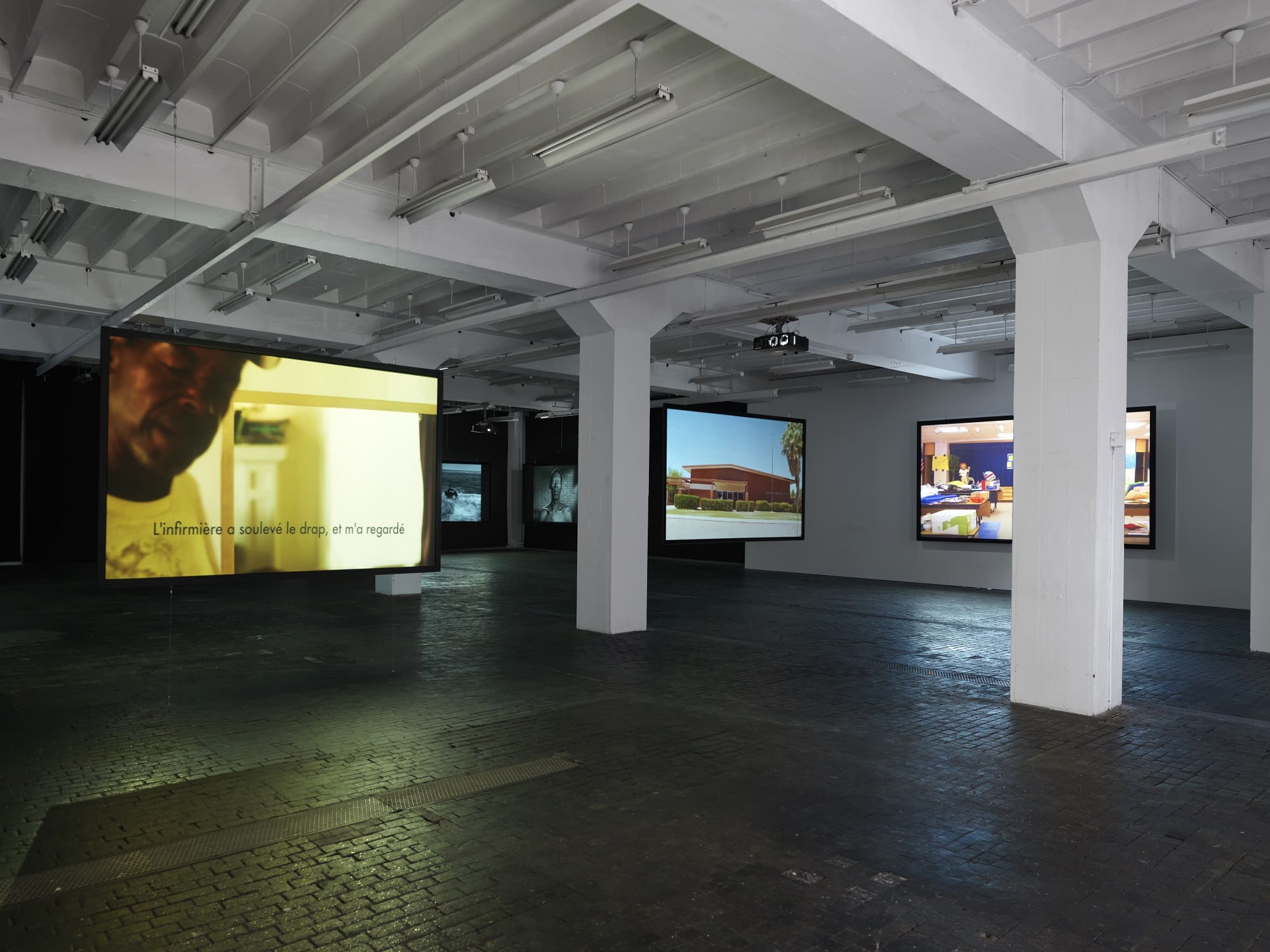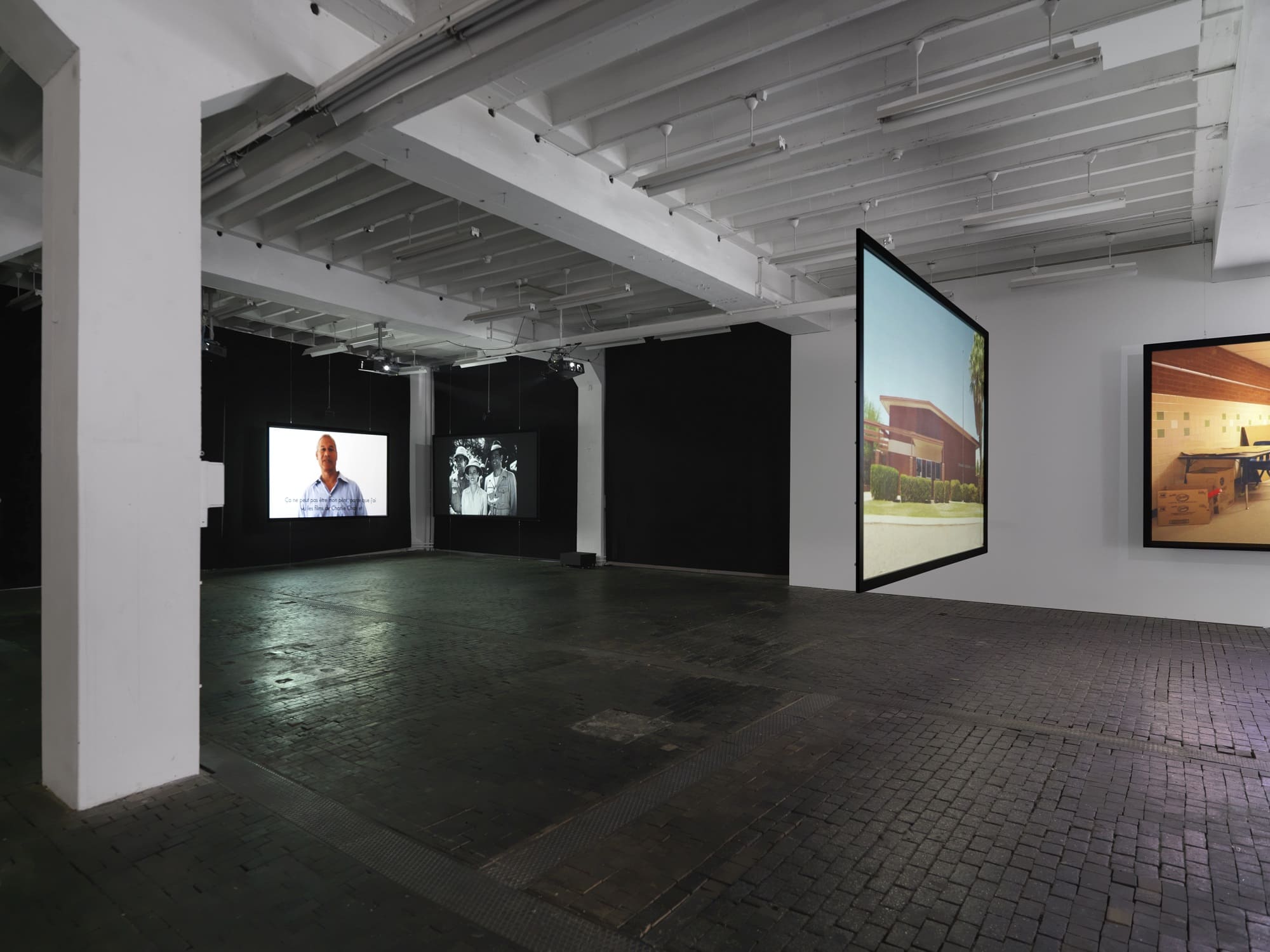 Untitled (David and Darby) consists of a single-channel video and a two-channel video projection. The installation brings together the two separate personal stories of Darby – through his son CJ – and David. CJ, the son of the now dead film actor Darby Jones (1910-1986), attempts to rebuild a relationship with his father through old Hollywood film footage. In the adjacent single channel video, David – a man the artist met on the street – recounts the loss of his left arm while creating the illusion of a recovered limb through a mirror reflection; a technique used to help patients get rid of a painful phantom limb. Miller’s videos grant these individuals a space in which they “reconstitute their dramatic losses, as opposed to representing themselves. They are specific attempts at retribution using representation as a tool”; in CJ’s case for example through appropriated and edited footage of his father’s stereotypical roles –the butler, the crazed zombie, the African chief -, usually assigned to African American actors in the early days of the Hollywood film industry.