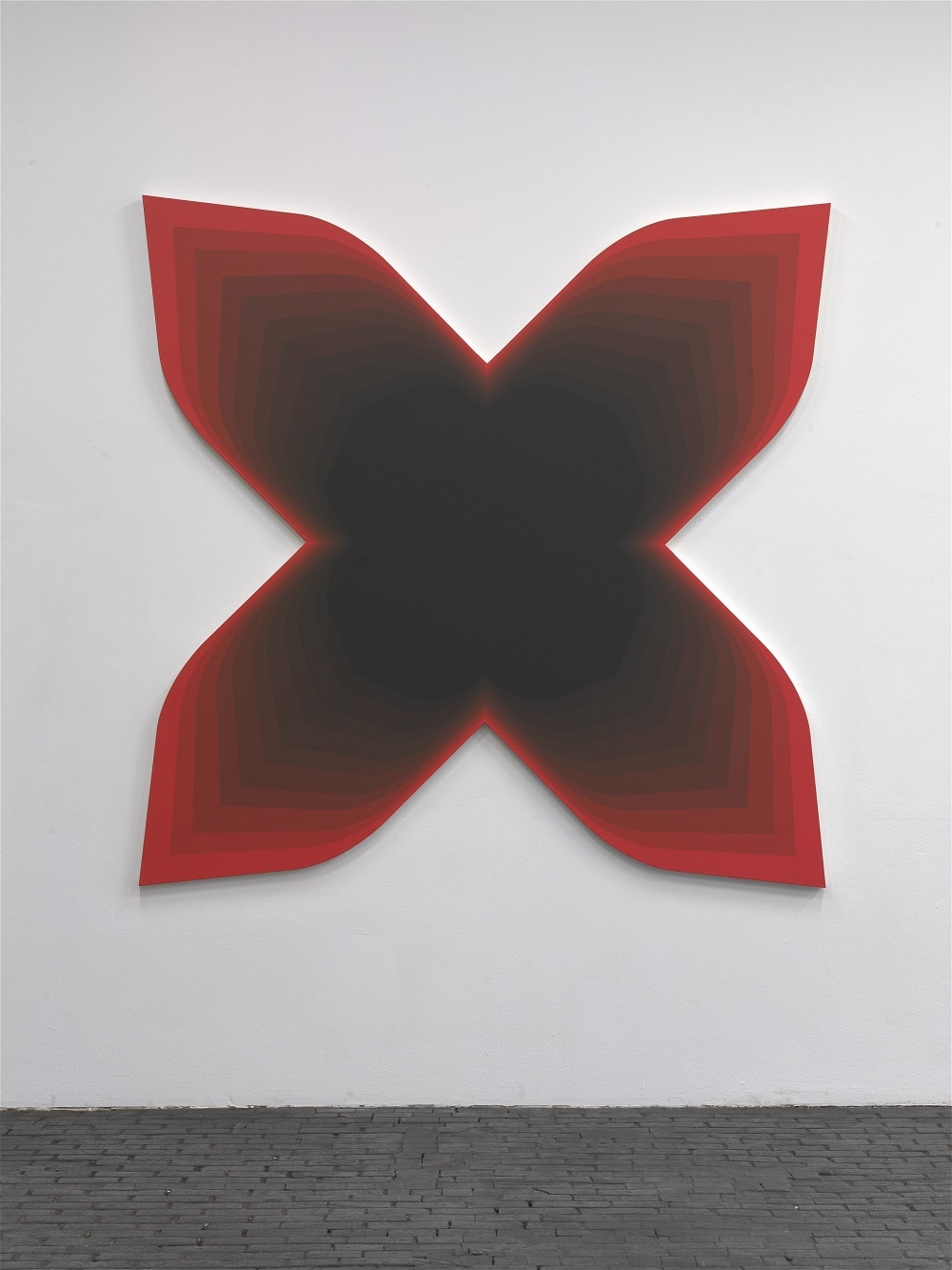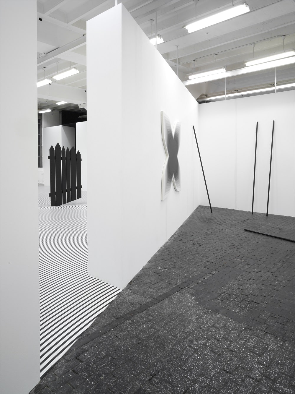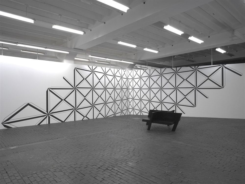 The variety of visual sources he employs is present only subtly in the work. For example the wall painting ‘DK’ builds upon and distorts the logo of a Californian punk rock band from the 1980s called Dead Kennedys, so as to produce an optical effect which plays with the open angle of the wall. Another example, the deformed bench entitled ‘Process’, is in fact an interpretation of a Moholy-Nagy design angled in two planes, rendering it impossible to use and converting it to an icon.
