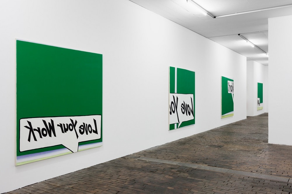 Rochelle Feinstein has an affinity for clichés and empty phrases. Having A Wonderful Time (1992) is one of those, Love Your Work (1999-2000/2014) would be another. Her use of language is matched by an equally cliché commitment to the language of abstraction: the “modernist grid”, hard-edged or expressionistic compositions, etc. These widely recognized tropes function as access points into a layered practice that disrupt any notion of purity (whether that of “Abstraction”, the “Artist’s Voice”, etc.), and yields a vast array of possible interpretations.