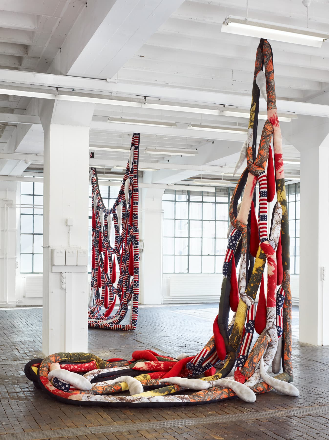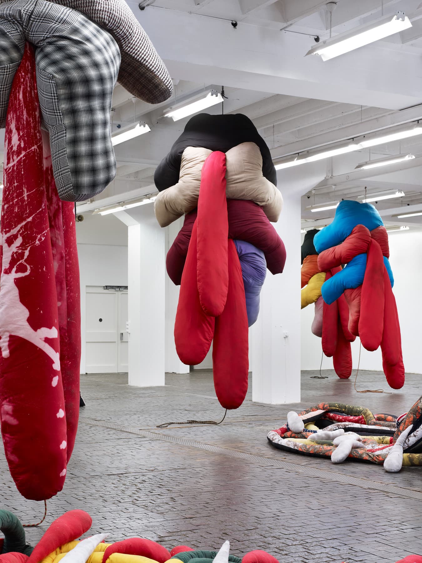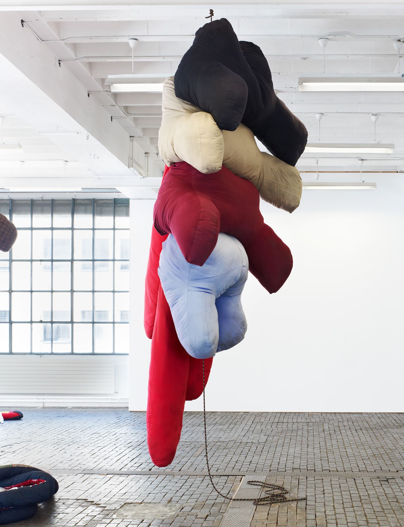 In some of these works, using pillows, blankets and quilts, Sterling Ruby’s concern is an elucidation of an underlying terror or fear at the heart of the American concept of the domestic. At the same time the artist uses these materials – stuffed fabrics – to transform threatening or aggressive subject matter into playfully pop-like forms, alluding to the consumerist insatiability of Western capitalism. These sculptures also explore space and the “gender” of the material – which tends to have feminine associations – just as Ruby has done with other works, ceramics in particular.