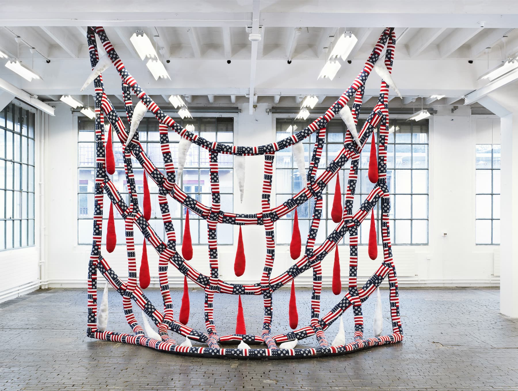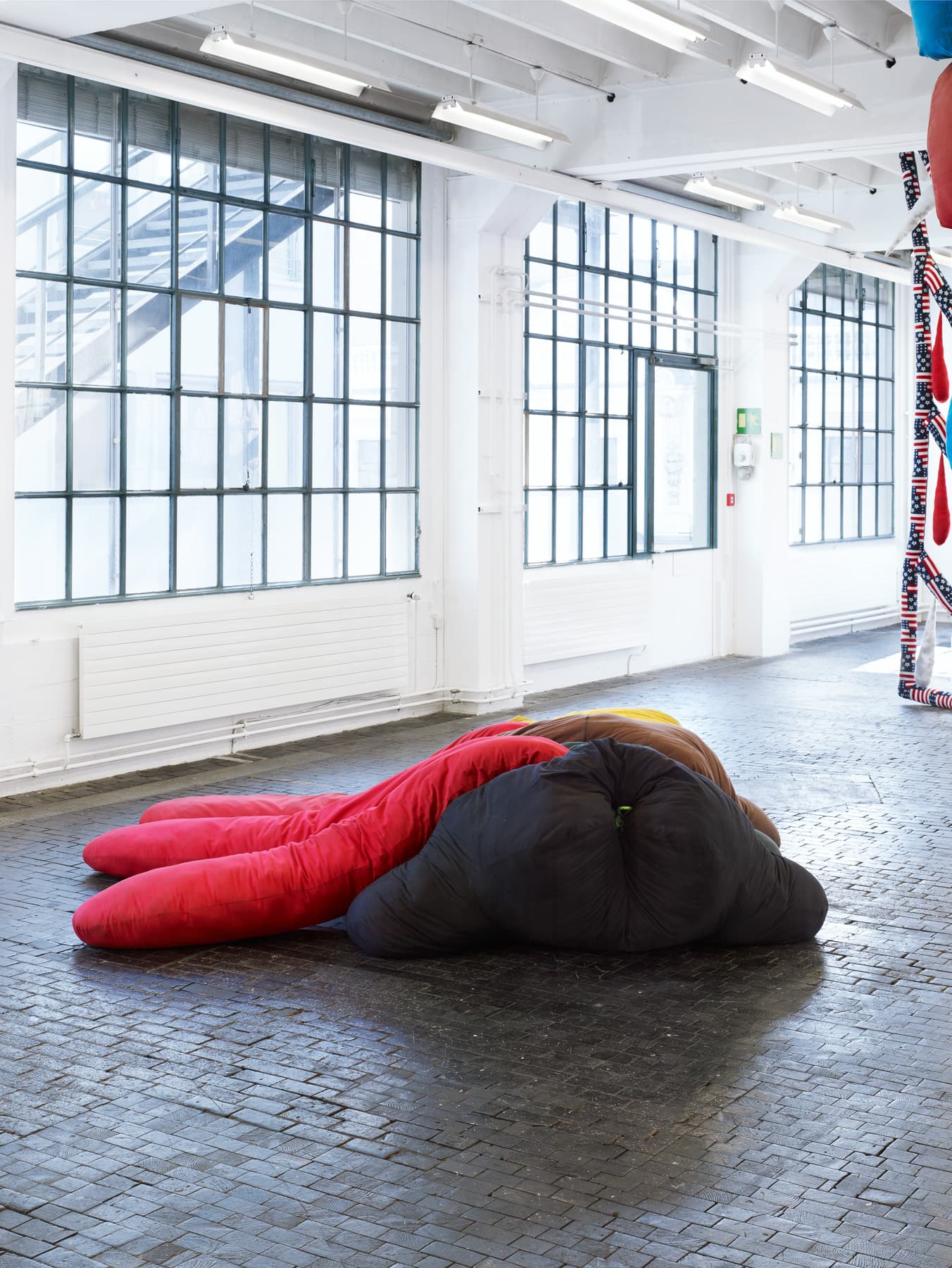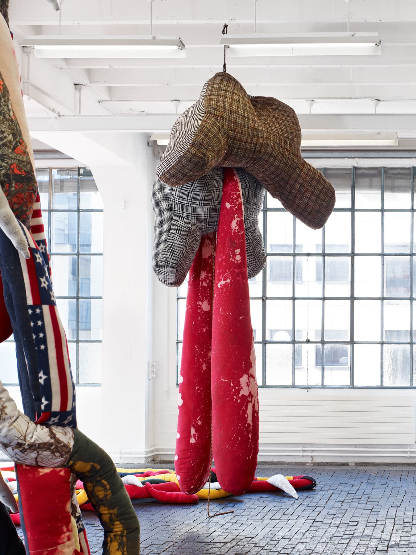 In some of these works, using pillows, blankets and quilts, Sterling Ruby’s concern is an elucidation of an underlying terror or fear at the heart of the American concept of the domestic. At the same time the artist uses these materials – stuffed fabrics – to transform threatening or aggressive subject matter into playfully pop-like forms, alluding to the consumerist insatiability of Western capitalism. These sculptures also explore space and the “gender” of the material – which tends to have feminine associations – just as Ruby has done with other works, ceramics in particular.