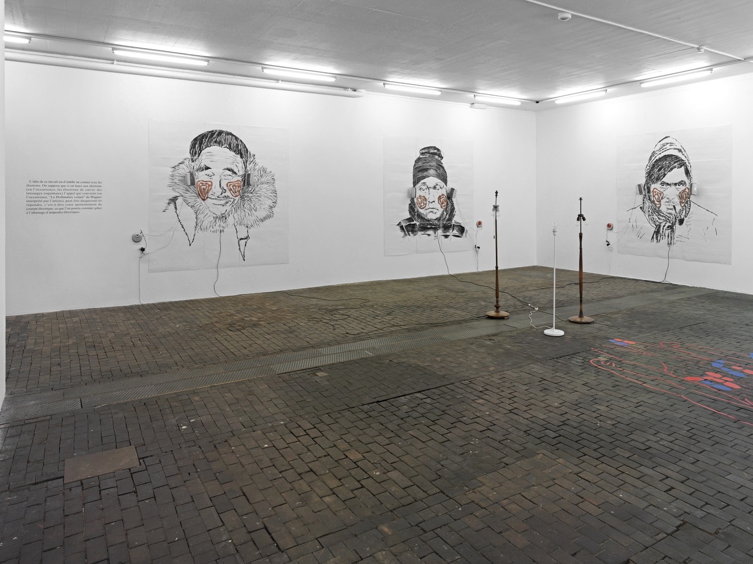“The Names of Electrons 2” (1999-2000) is yet another scientific experiment that is destined for failure. The installation soundtrack (the artist singing Wagner) attempts to activate relations between the electrons of the copper tattoos on the Eskimos’ cheeks that are drawn on paper.
