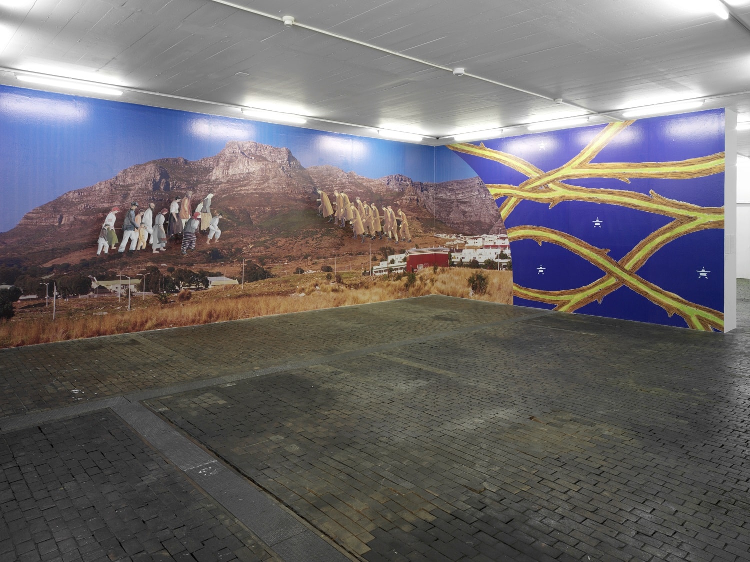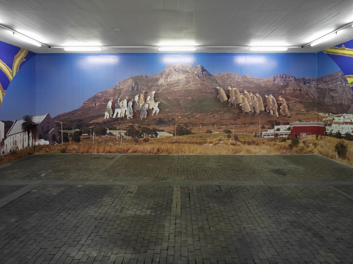 Amongst the presented works, a mural photograph entitled “Katyn Victims and Khatin Victims meet on a Dusty Road on the Hills near Cape Town” (2005) revisits a World War 2 event that still poisons the relations between Poland and Russia. The artist refers to various theoretical texts, amongst which Russian thinker N. F. Fyodorov’s “Philosophy of the Common Task”, published in 1906. This theory defines common good as an actual, physical revival of each and every person who has lived on earth so far. Then the victims seem to share, through their ascent in the air and through photomontage, a common and mysterious fate. Moreover, the monumental work is ornate with oriental decorations that add to mystery.