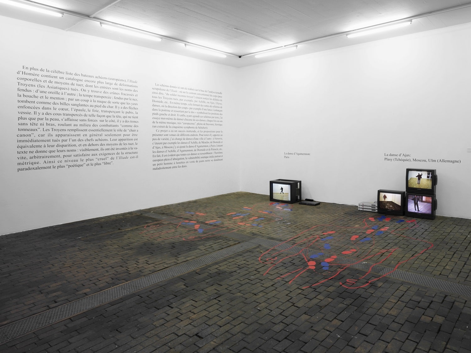 The whole arrangement of the exhibition physically translates this cacophony of references, as the same audio-video tape is played at simultaneous, non-synchronised pace on a dozen monitors scattered in the exhibition space. The artist awkwardly dances a kind of tribute to Trojan War heroes to an excerpt of Schubert’s Fifth Symphony (“The Dances of Killed Trojans”, 1999-2000). The clashing superimposition of musical lines recalls 1960’s serial music, endowing the exhibition with a hypnotic effect.