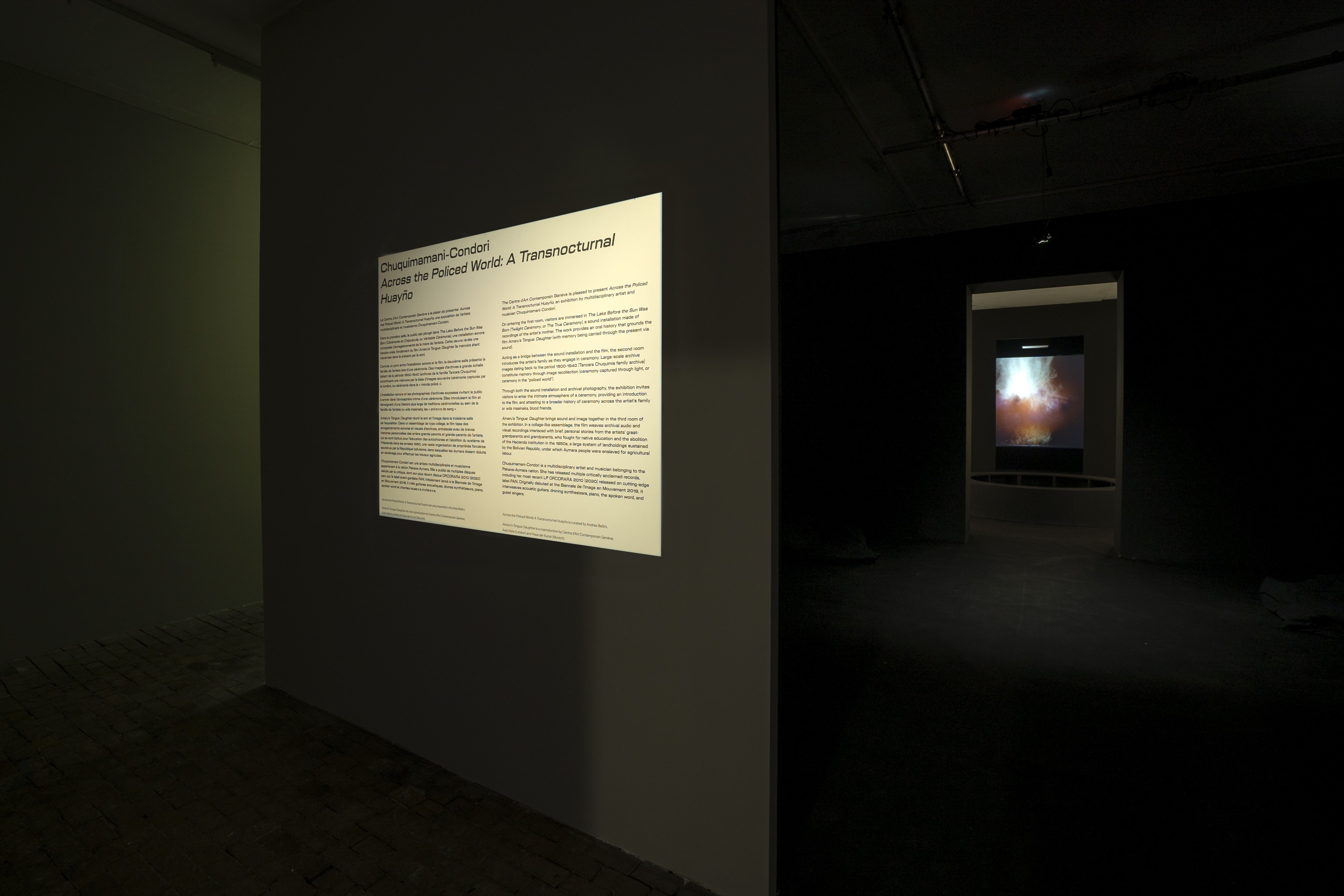 Amaru’s Tongue: Daughter est commissionné par Auto Italia et coproduit par le Centre d’Art Contemporain Genève, Auto Italia, Haus der Kunst et l’Arsenic – Centre d’art scénique contemporain. Le film a été présenté en première simultanément à Londres et à Munich. À Genève, il est présenté pour la première fois dans le cadre d’une installation plus vaste de trois pièces, réalisée par Chuquimamani-Condori. Across the Policed World : A Transnocturnal Huayño est une proposition d’Andrea Bellini. L’artiste propose au public une présentation autour de l’exposition à 20h le soir du vernissage le vendredi 4 mars.